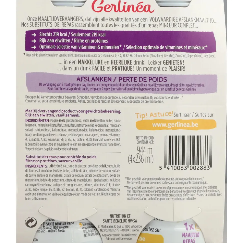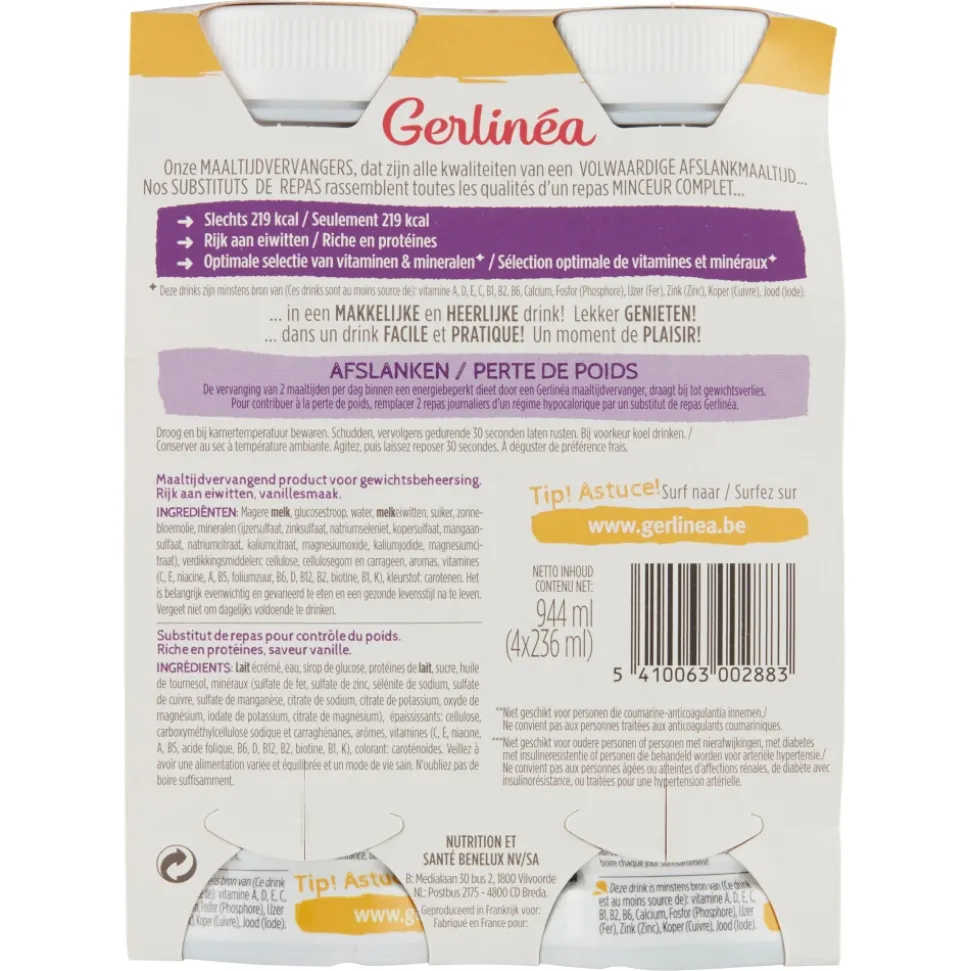 Neem deze Gerlinéa drink mee in je tas en verwen jezelf met een snelle en evenwichtige maaltijd. Eenvoudig te gebruiken: Schudden, even laten rusten en genieten maar. Bij voorkeur koel drinken. Vervang één van je hoofdmaaltijden door een Gerlinéa afslankdrink voor gewichtsbehoud. Voor gewichtsverlies vervang je twee maaltijden per dag door een maaltijdvervanger.
