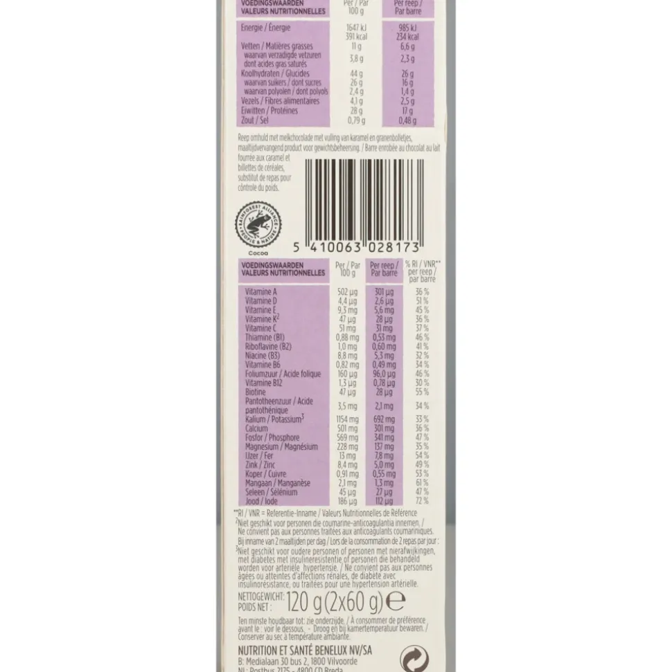 Glucosestroop, melkchocoladecoating 17% (suiker, cacaoboter^1, magere melkpoeder, weipoeder, cacaomassa^1, melkvet, emulgator: sojalecithinen, natuurlijk vanillearoma), sojacrisps 14% (sojaeiwitten, tapiocazetmeel, zout), gemalen geroosterde soja, invertsuikerstroop, sojaschilfers, granenbolletjes 3,1% (rijstbloem, tarwebloem, ruwe rietsuiker, tarwemout, tarwegluten, zout), karamel 1,9% (rietsuiker, water), stabilisator: glycerol, havervlokken, mineralen (kaliumzouten van orthofosforzuur, calciumcarbonaat, magnesiumoxide, zinksulfaat, mangaangluconaat, elementair ijzer, kopercitraat, kaliumjodide, natriumseleniet), zonnebloemolie, aroma’s, zeezout, emulgator: sojalecithinen, kleurstof: karamel, vitaminen (C, E, niacine, A, pantotheenzuur, D, B12, B1, B2, B6, K, foliumzuur, biotine).