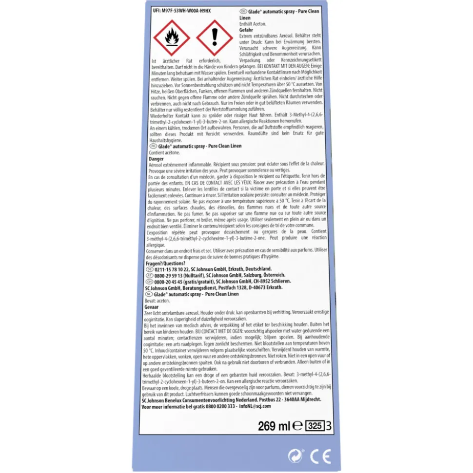 Glade Automatic Spray Pure Clean Linen houder geeft week na week een verfrissende geur af van versgewassen linnen .