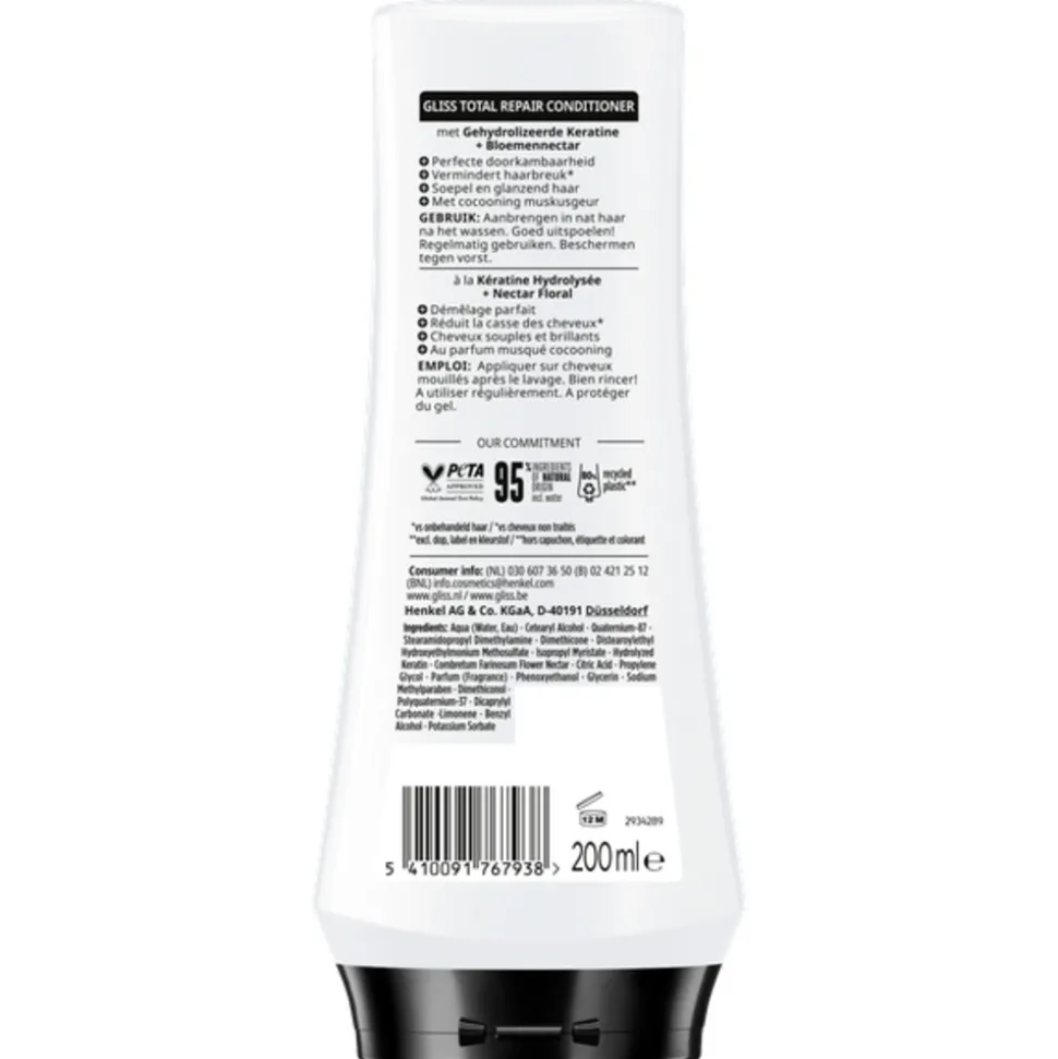 Hoe gebruik je de Gliss Kur Total Repair Conditioner? Breng de conditioner aan op nat en gewassen haar. Laat de conditioner even intrekken en was het daarna grondig uit.