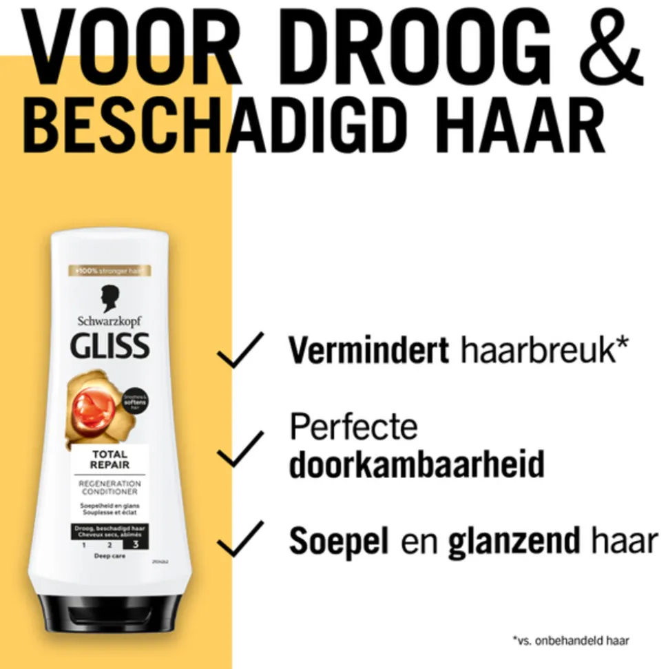 Ontdek het 3 stappenplan van Gliss Kur Total RepairOm beschadigd, breekbaar of droog haar te herstellen, is een aangepaste verzorging nodig. De Total Repair lijn van Gliss Kur herstelt het haar in de diepte en zorgt na gebruik dat je haar er weer glad en soepel uitziet. Voor een optimaal resultaat, raden wij het gebruik van ons drie stappenplan aan: