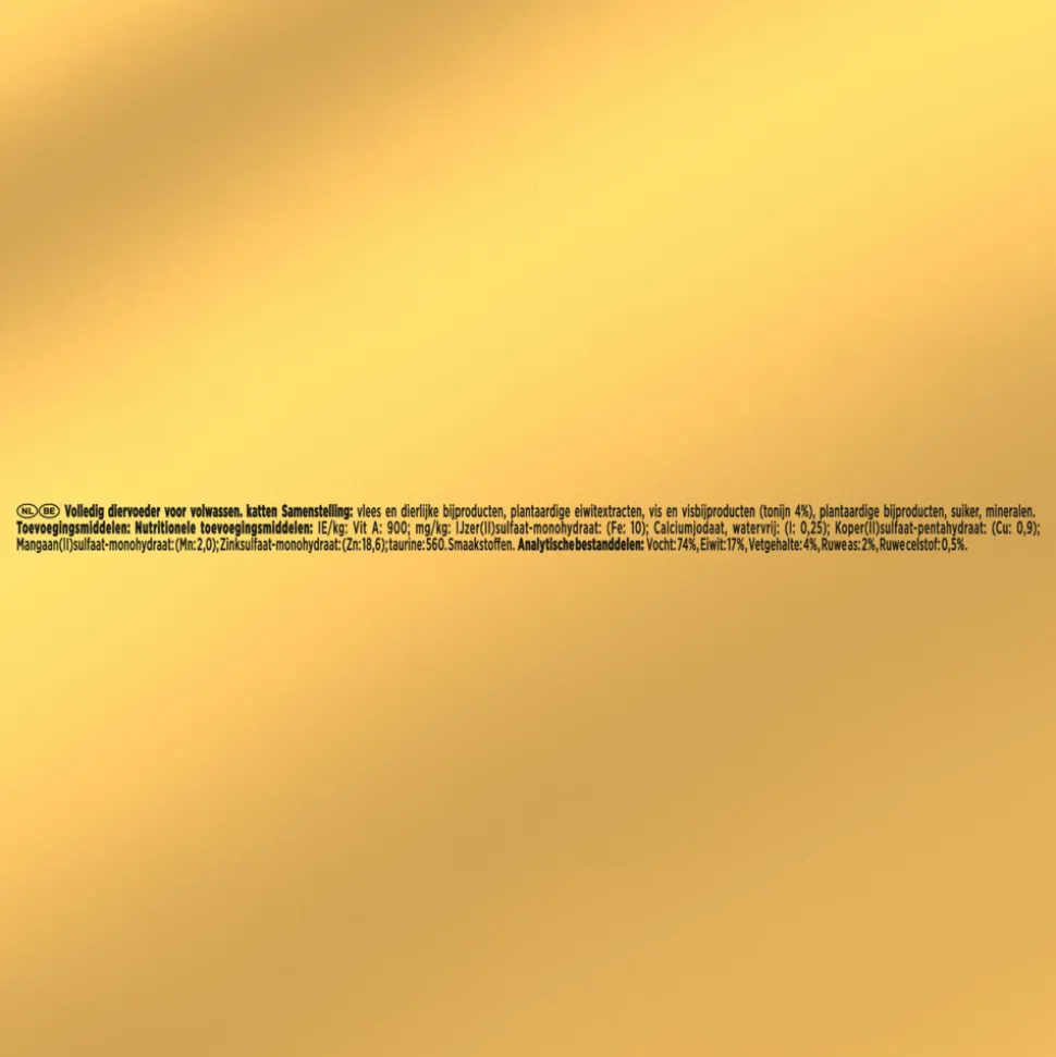 Vlees en dierlijke bijproducten, plantaardige eiwitextracten, vis en visbijproducten (waarvantonijn 4%), plantaardige bijproducten,mineralen, suiker. Analytische bestanddelen: Vocht: 74,0%; Eiwit: 17,0%; Vetgehalte: 4,0%; Ruwe as: 2,0%; Ruwe celstof: 1,1% Toevoegingsmiddelen: Nutritionele toevoegingsmiddelen: IE/kg: Vit. A: 880; Vit. D3: 135;mg/kg: IJzer(II)sulfaat-monohydraat: 31;Calciumjodaat, watervrij: 0,39; Koper(II)sulfaat-pentahydraat: 3,5;Mangaan(II)sulfaat-monohydraat: 6,1; Zinksulfaat-monohydraat: 50;Technologische toevoegingsmiddelen: mg/kg: Cassiagom 450.