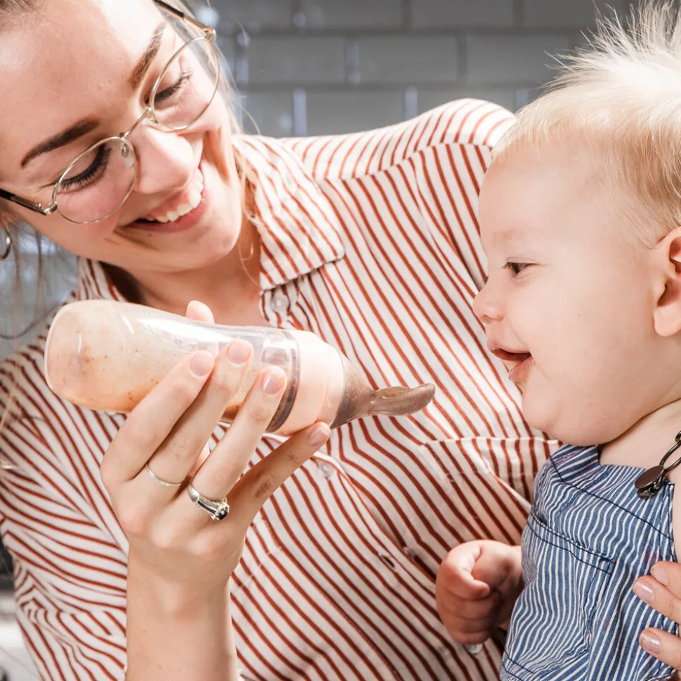 Een babyfles en lepel in 1! Makkelijk en praktisch om overal mee te nemen of voor dagelijks gebruik voor zijn/haar eerste hapjes.