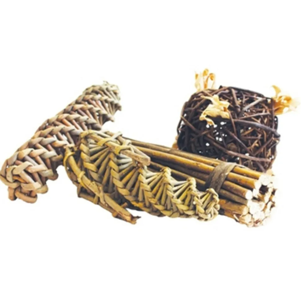 Dit natuurlijke setje is zowel leuk voor jouw knaagdier om mee te spelen alswel dat het lekker is om op te knagen. Wilgentakjes doen het altijd goed bij knaagdieren en konijnen. Het speelgoed is: