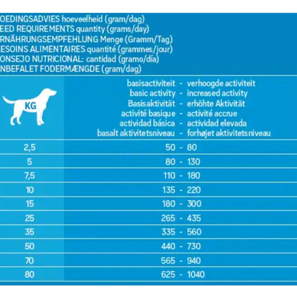 Zeer actieve honden hebben vanzelfsprekend meer nodig, minder actieve honden hebben minder nodig. Onder basisactiviteit wordt verstaan: 1 uur per dag wandelen, onder verhoogde activiteit 2 tot 3 uur per dag wandelen + rennen en spelen.