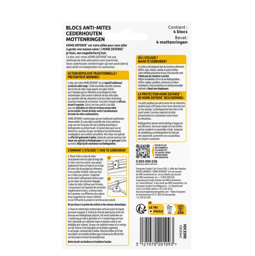 De Home Defense Kledingmotten Ringen bieden een natuurlijke en effectieve bescherming tegen kledingmotten. De ringen zijn gemaakt van cederhout en bevatten essentiële oliën die motten afweren zonder een geur achter te laten op textiel. Ze camoufleren de geur van kledingvezels, waardoor motten minder snel worden aangetrokken. Dankzij de centrale opening hang je ze eenvoudig aan kledinghangers. De ringen werken direct en blijven tot zes weken effectief. Een ideale, preventieve oplossing om schade aan kleding en andere stoffen te voorkomen.