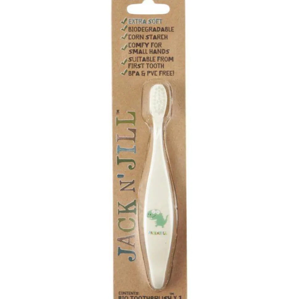 Jack N’ Jill Tandenborstel Dino heeft een handvat dat voor 100% gemaakt is uit maiszetmeel en zachte, recycleerbare nylonharen. Het is de eerste in zijn soort, speciaal ontwikkeld voor kinderen van 2-6 jaar.