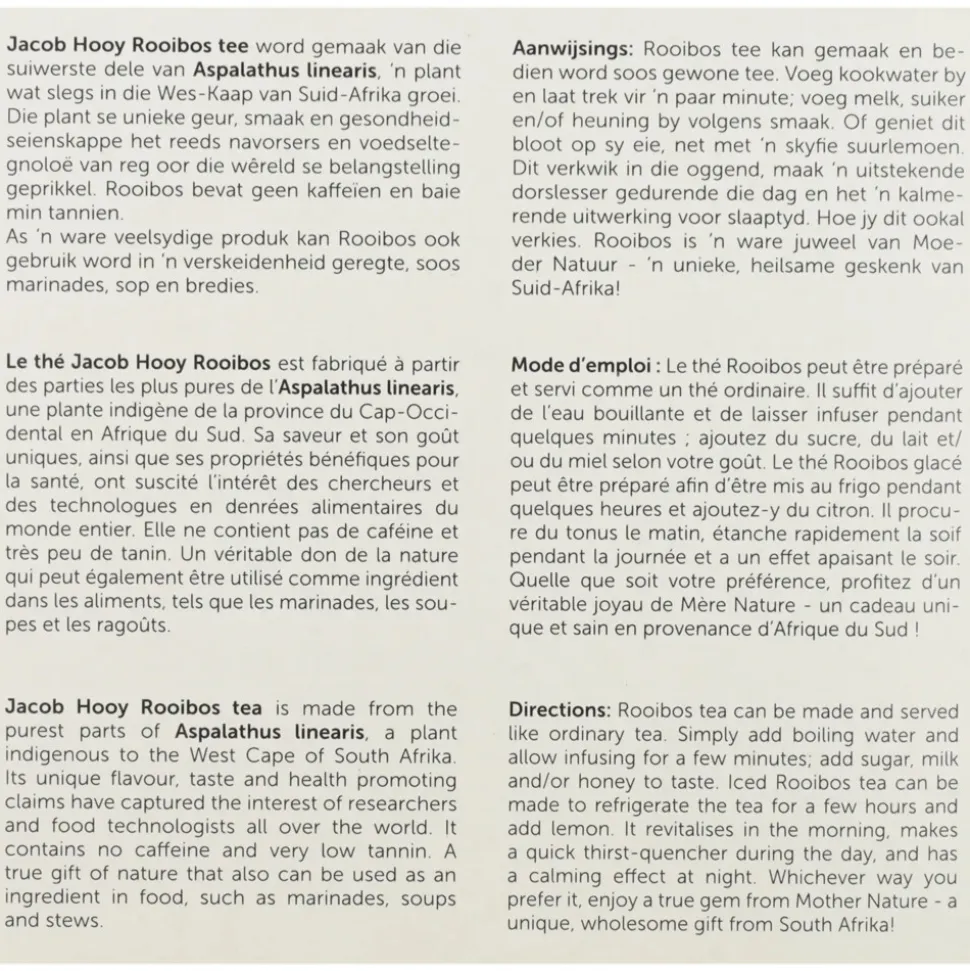 Jacob Hooy Rooibosthee 160st is zuiver en natuurlijk en bovendien zeer aangenaam van smaak. Het bevat geen bij mengingen, conserveermiddelen of kleurstoffen.