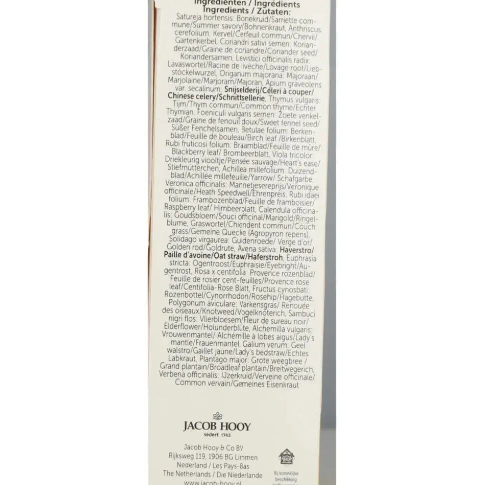 Bonenkruid (satureja), kervel (anthriscus cerefolium), korianderzaad (coriandri sativi semen), lavaswortel (levistici officinalis radix), majoraan (origanum majorana), selderijblad (apium graveolens var. secalinum), tijm (thymus), venkelzaad (foeniculi vulgaris semen), berkenblad (betulae folium), braamblad (rubi folium), driekleurig viooltje (viola tricoloris), duizendblad (achillea millefolium), ereprijs (veronica), frambozenblad (rubi idaei folium), goudsbloem (tagetes), graswortel (agropyrum repens), guldenroede (solidago), haverstro (avena sativa), ogentroost (euphrasia), rozenblad (rosae folium), rozenbottel (rosae caninae baca), varkensgras (polygonum), vlierbloesem (sambuci flos), vrouwenmantel (alchemilla alpina), walstro (galium verum), weegbree groot (plantago major), ijzerkruid (verbena officinalis).