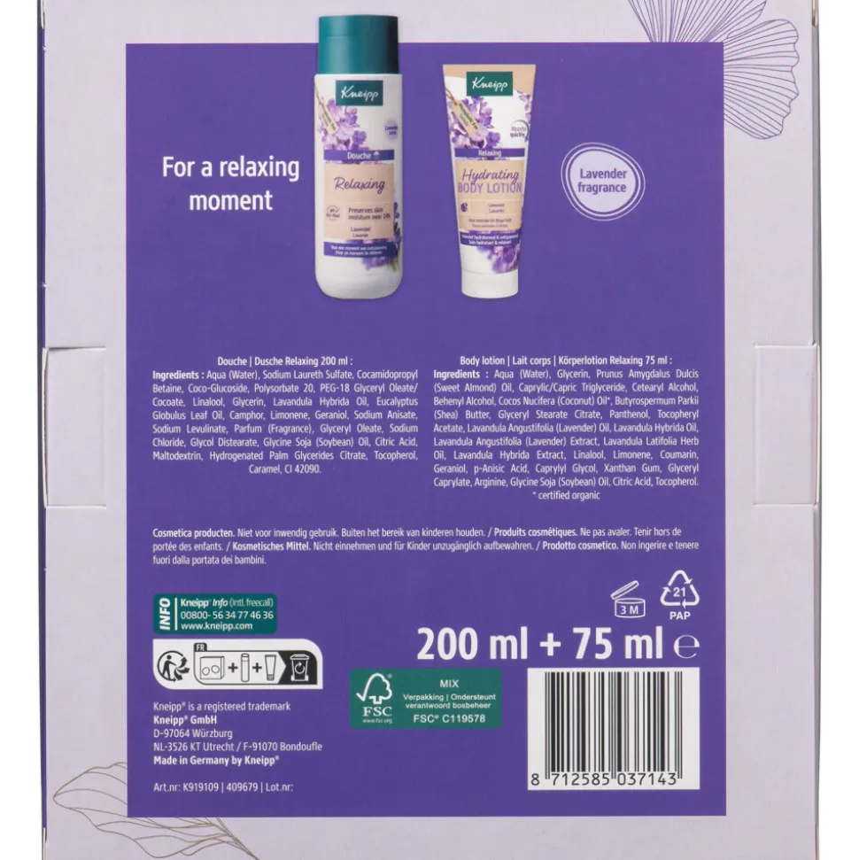 Ontspannende verzorging voor douche en body. De Kneipp Geschenkset Relaxing Moments is een cadeautip voor iedereen die een extraatje heeft verdiend. Deze cadeauset biedt heerlijke ontspannende verzorgingsmomenten. De natuurlijke etherische lavendelolie heeft kalmerende en stressverminderende eigenschappen, wat helpt bij ontspanning en een goede nachtrust. De verpakking met gouden details is een cadeau op zich.