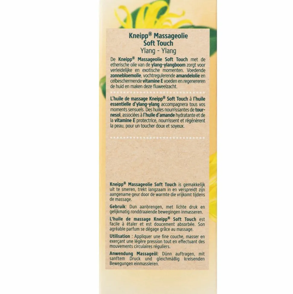 De Kneipp massageolie Soft Touch Ylang-Ylang met de etherische olie van de ylang-ylangboom zorgt voor verleidelijke en exotische momenten. Voedende zonnebloemolie, vochtregulerende amandelolie en celbeschermende vitamine E voeden en regenereren de huid en maken deze fluweelzacht. De verleidelijke-exotische geur van ylang-ylang-olie, gewonnen uit de bloesem van de ylang-ylang-boom, heeft een ontspannend, harmoniserend en stimulerend effect. Zonnebloemolie wordt gebruikt in huidverzorgingsproducten vanwege de uitstekende huidverzorgende eigenschappen en de goede verdraagzaamheid.
