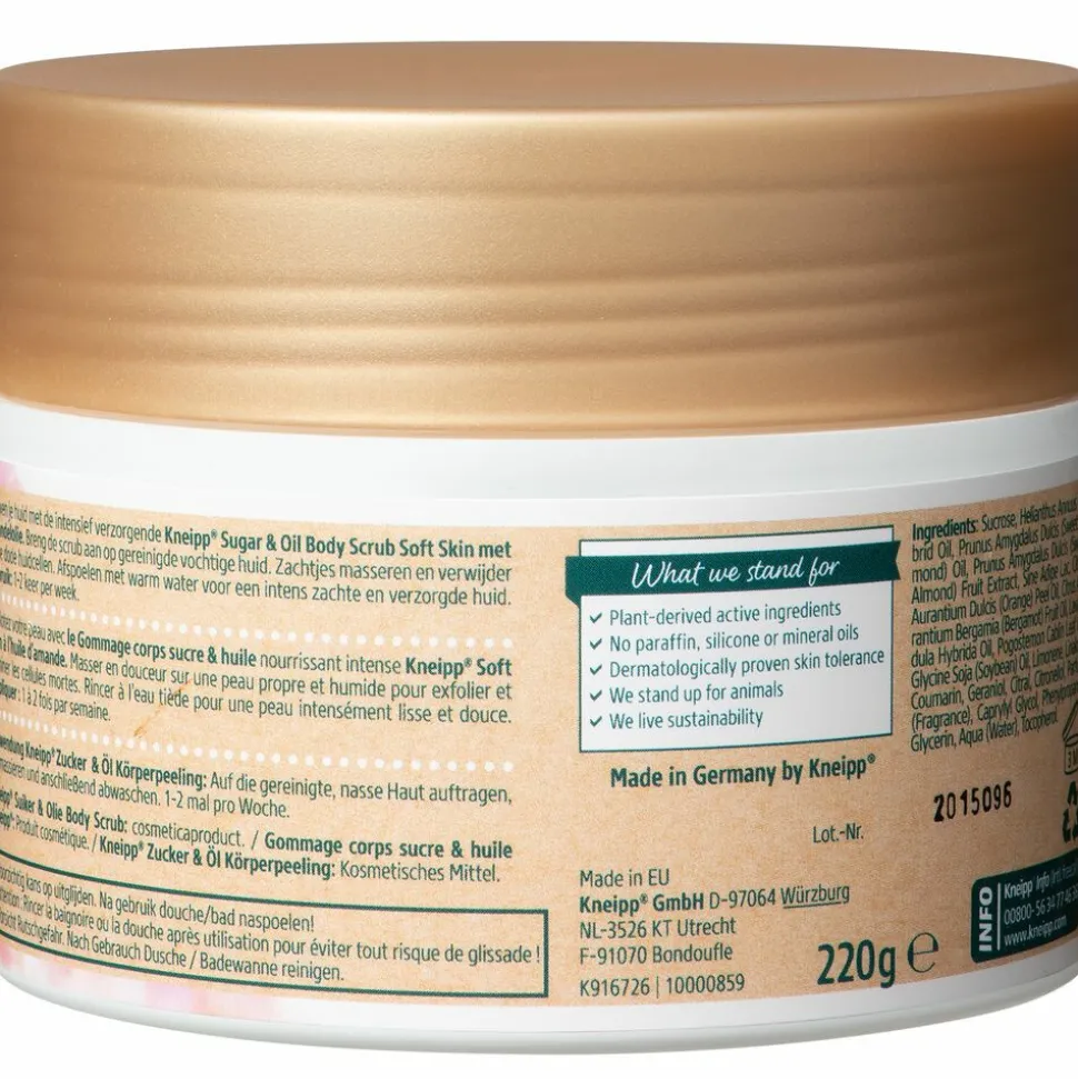 De sugar body scrub verwijderd de dode huidcellen eenvoudig en op een milde wijze. Zo krijg je snel een heerlijk zacht en stralende huid. Samen met de betoverende geur is het een pure verwennerij voor je huid. Door de milde samenstelling van Kneipp Sugar Body Scrub is het ook geschikt voor de gevoelige en/of droge huid. Gebruik: Masseer de scrub zachtjes in op een vochtige huid. Verwijder zo de dode huidcellen. Hierna afspoelen met water. Minimaal één à twee keer per week gebruiken voor het beste resultaat. De huid gaat stralen en de bruine teint blijft langer behouden.