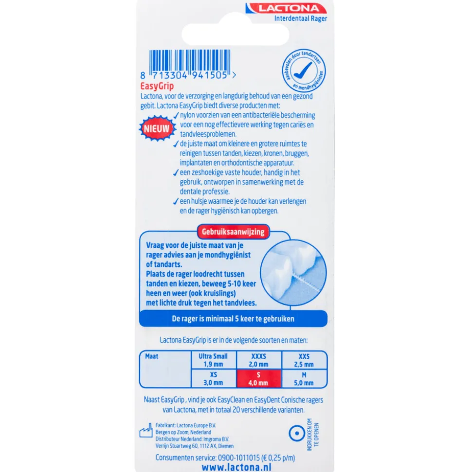Lactona EasyGrip Ragers S Groen 4.0 mm zijn ontworpen voor grondige en comfortabele reiniging tussen tanden en kiezen. De ergonomische zeshoekige grip zorgt voor optimale controle en ligt prettig in de hand. Voor beter bereik achter in de mond plaats je eenvoudig de dop op de achterkant van de grip. Handig en hygiënisch, ook voor onderweg. De rager heeft zachte, antibacteriële nylon haren en een kunststof gecoat ijzerdraad dat extra bescherming biedt aan tanden en tandvlees. Geschikt voor dagelijks gebruik, ook bij kronen, bruggen, implantaten en vaste beugels.