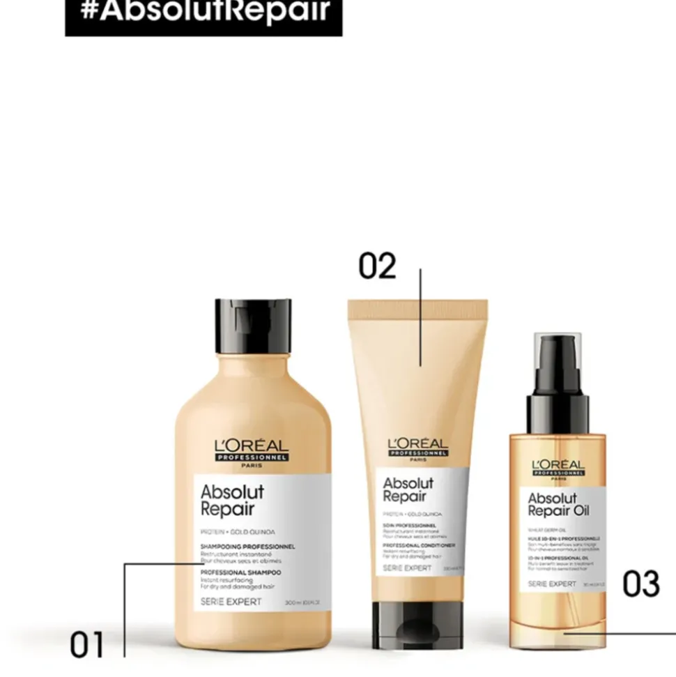 Was het haar met L’Oréal Absolut Repair Shampoo en verwijder overtollig water. Breng een ruime hoeveelheid conditioner aan op het haar, met name op de lengtes en punten. Laat de conditioner 2-3 minuten inwerken. Grondig uitspoelen met water.