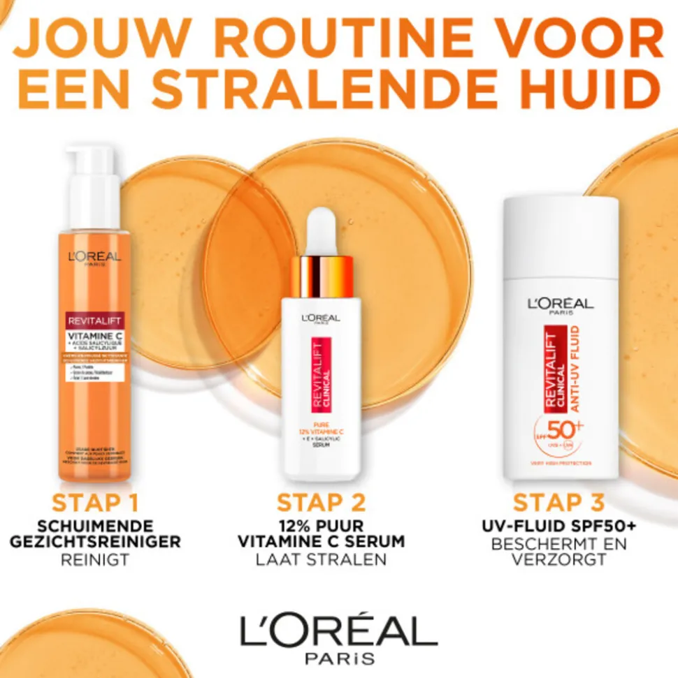 Ontdek het baanbrekende Clinical 12% Pure Vitamine C + E + Salicylzuur Serum van L’Oréal Paris Revitalift. Geformuleerd met pure en stabiele vitamine C in een hoge concentratie. Al bij het eerste gebruik is het Serum effectief tegen dofheid, een ongelijkmatige teint en de eerste tekenen van veroudering. Bevat vitamine E, een actieve stof welke de verhelderende eigenschappen van vitamine C versterkt. Daarnaast helpt vitamine E het salicylzuur met het gladstrijken van de huidtextuur en het verminderen van zichtbare poriën. Het L’Oreal Paris Revitalift Clinical 12% Pure Vitamine C + E + Salicylzuur Serum corrigeert zichtbaar de 3 belangrijke tekenen van vroege veroudering*: ongelijkmatige teint, zichtbare poriën en fijne lijntjes. Geschikt voor alle huidtypes en huidskleuren. *klinische test, 63 proefpersonen, 8 weken.