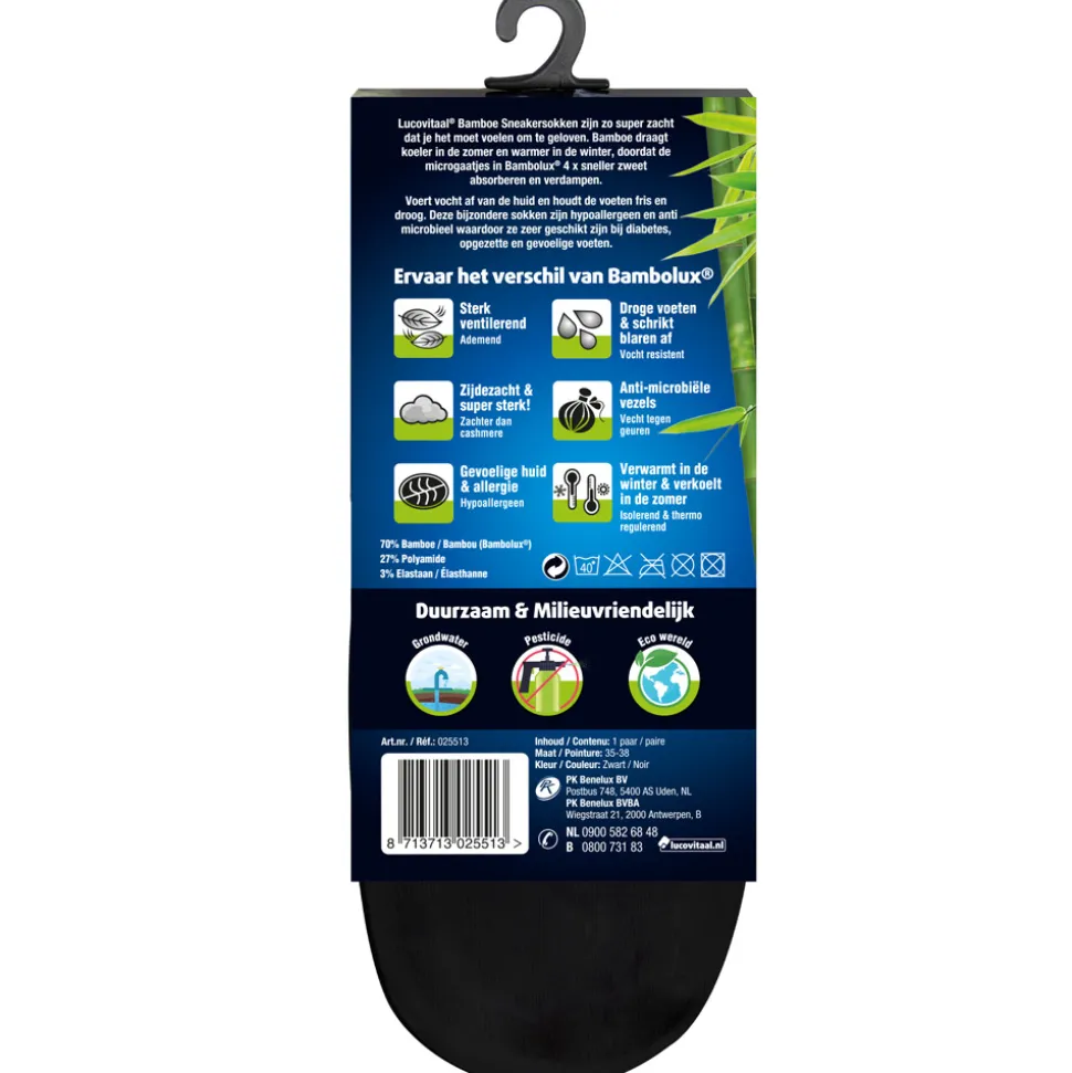 Lucovitaal Bamboe Sneakersokken zijn zo super zacht dat je het moet voelen om te geloven. Bamboe draagt koeler in de zomer en warmer in de winter, doordat de microgaatjes in Bambolux® 4 x sneller zweet absorberen en verdampen. Voert vocht af van de huid en houdt de voeten fris en droog. Deze bijzondere sokken zijn hypoallergeen en antimicrobieel waardoor ze zeer geschikt zijn bij diabetes, opgezette en gevoelige voeten.