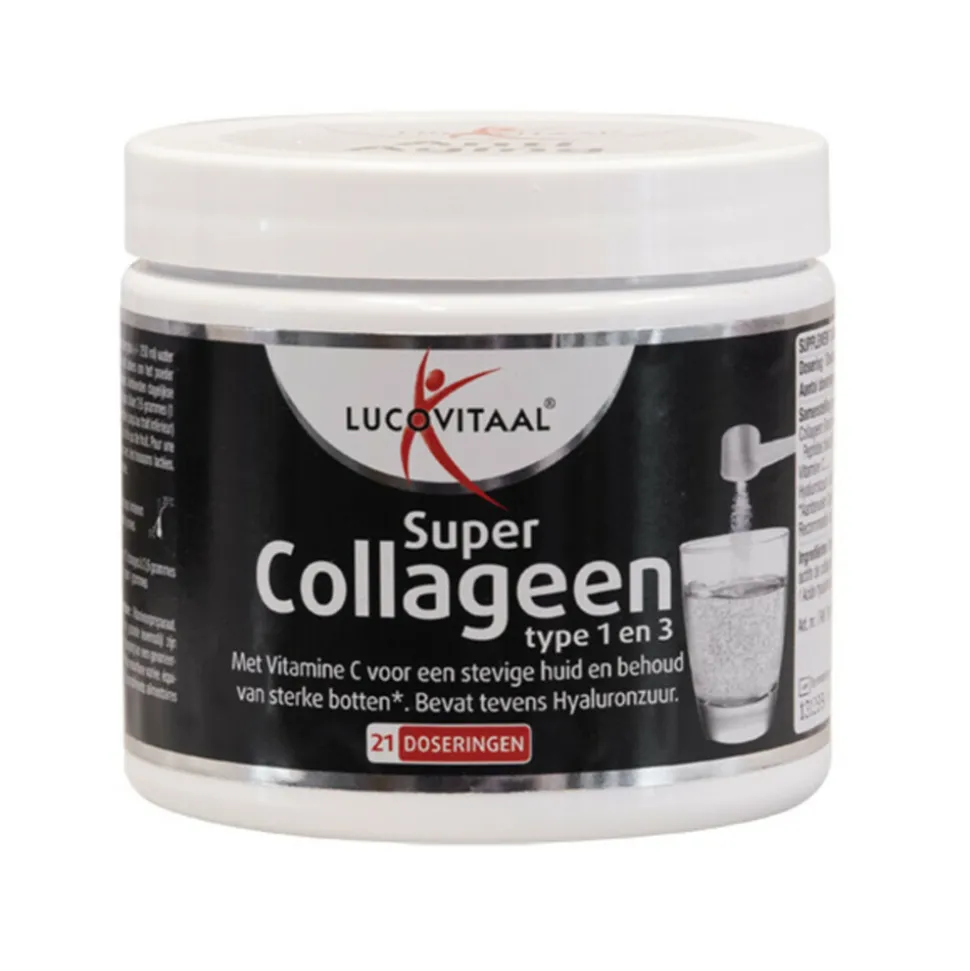 Collageen Beauty poeder van Lucovitaal is gemaakt voor volwassenen. Het bevat vitamine C dat bij draagt aan de vorming van collageen en helpt om de huid (van binnenuit) te verstevigen. Voor het behoud van sterke tanden en botten.Collageen is een lichaamseigen eiwit en een belangrijk bestanddeel van ons bindweefsel. Kraakbeen, botten, pezen, huid en tanden bestaan grotendeels uit collageen. Het lichaamseigen collageen behoudt de stevigheid en elasticiteit van de huid. Na het 25e levensjaar verandert de productie van collageen. De huid kan verouderen, rimpels kunnen ontstaan en de huid kan slapper worden. Aan Collageen Beauty poeder van Lucovitaal is vitamine C toegevoegd. Vitamine C is een antioxidant dat helpt de cellen te beschermen tegen invloeden van buitenaf zoals zonlicht en vervuiling. De toegevoegde hyaluronzuur is een stof die van nature in het bindweefsel van de huid aanwezig is en helpt bij een droge huid.Lucovitaal Collageen Beauty Poeder:- Draagt bij aan de vorming van collageen dat helpt om de huid te verstevigen