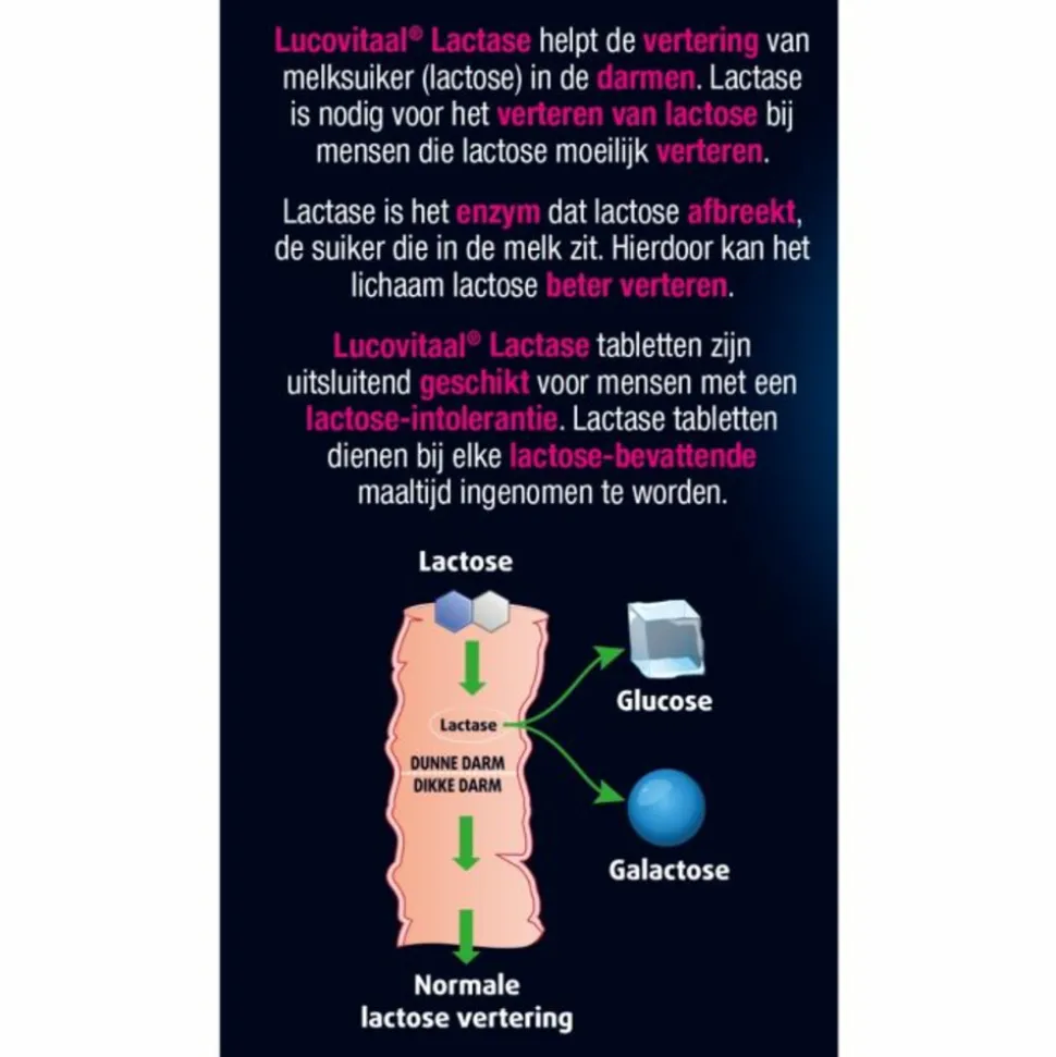 Lucovitaal Lactase 7000 FCChelpt de vertering van melksuiker (lactose) in de darmen. Lactase is nodig voor het verteren van lactose bij mensen die lactose moeilijk verteren. Lactase is het enzym dat lactose afbreekt, de suiker die in de melk zit. Hierdoor kan het lichaam lactose beter verteren.Lucovitaal Lactase tabletten zijn uitsluitend geschikt voor mensen met een lactose-intolerantie. De Lactase tabletten dienen bij elke lactose-bevattende maaltijd ingenomen te worden.