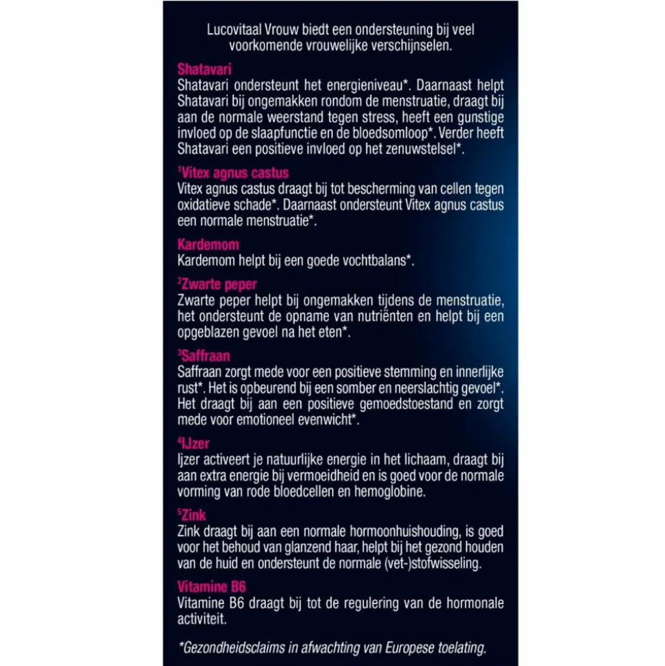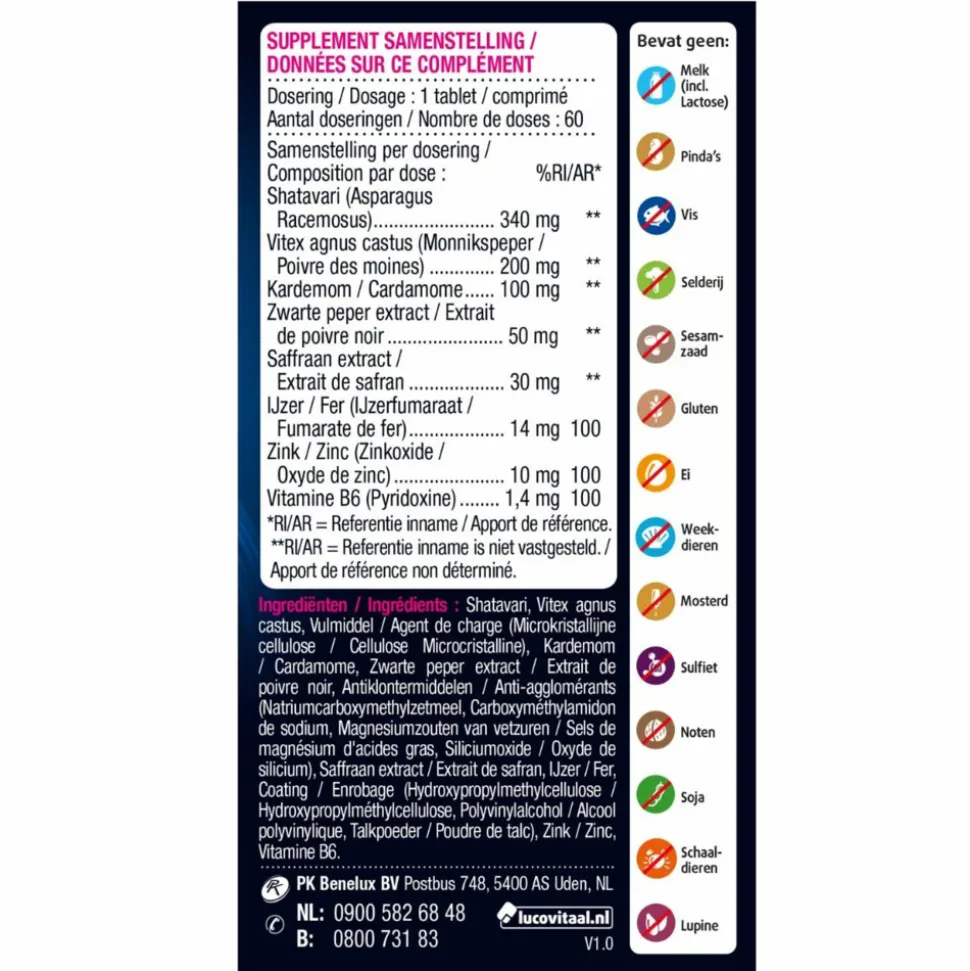 Shatavari, Vitex agnus castus, Vulmiddel (Microkristallijne cellulose), Kardemom, Zwarte peper extract, Antiklontermiddelen (Natriumcarboxymethylzetmeel, Magnesiumzouten van vetzuren, Siliciumoxide), Saffraan extract, IJzer, Coating (Hydroxypropylmethylcellulose, Polyvinylalcohol, Talkpoeder), Zink, Vitamine B6.