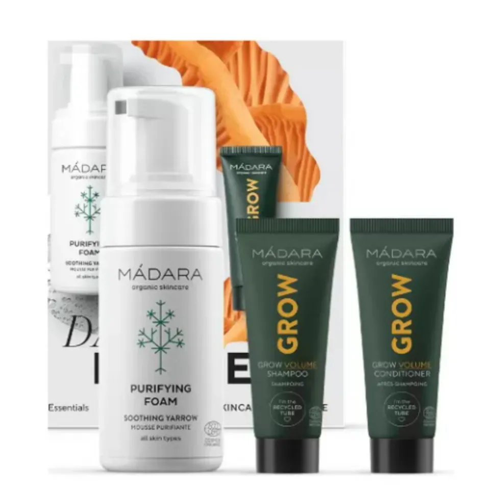 Deze huidverzorgingsset van 3 hero essentials in een formaat dat makkelijk in je bagage past, zorgt ervoor dat je huid, haar en hoofdhuid lekker schoon en fris blijven, waar je ook bent.Het is niet voor niks een bestseller. De Purifying Foam was zachtjes en gemakkelijk alle zuiverheden en make-upresten weg. Het met paddenstoelen versterkte groeiversterkende duo van haarverzorgingsmini’s reinigt effectief en hydrateert je lokken.