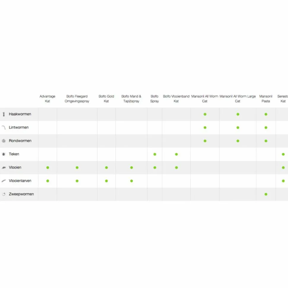 Mansonil All Worm Large Cat is een ontwormingsmiddel met een brede werking. Het doodt de belangrijkste rond- en lintwormen bij de kat met een éénmalige behandeling.
