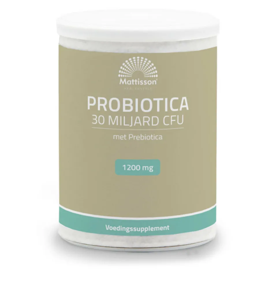 Mattisson Probiotica 30 Miljard CFU 1200mg is een pro- en prebiotica voedingssupplement. De darmen zitten vol met bacteriën, deze zijn nodig voor een gezonde darmwerking. Probiotica zijn levende micro-organismen zoals gisten of bacteriën. De probiotica van Mattisson Healthstyle is gevriesdroogd en bevat per gram 17 verschillende stammen en 30 miljard kolonievormende eenheden (CFU). De prebiotische FOS Inuline stimuleert de opname van de probiotica zodat het lichaam hier optimaal van profiteert.