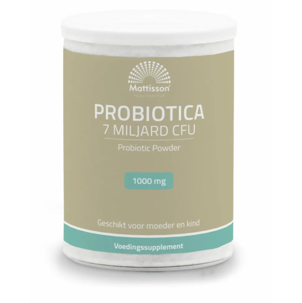 Mattisson Probiotica 7 Miljard CFU 1000mg is makkelijk in te nemen door op te lossen in water of yoghurt. De darmen zitten vol met bacteriën, deze zijn nodig voor een gezonde darmwerking. Probiotica zijn levende micro-organismen zoals gisten of bacteriën. De probiotica van Mattisson Healthstyle is gevriesdroogd en bevat per gram 6 verschillende stammen en 7 miljard kolonievormende eenheden (CFU). De prebiotische FOS Inuline stimuleert de opname van de probiotica zodat het lichaam hier optimaal van profiteert. Geschikt voor moeder en kind en voor zwangere vrouwen en vrouwen die borstvoeding geven (vóór en tot 6 maanden na de bevalling).