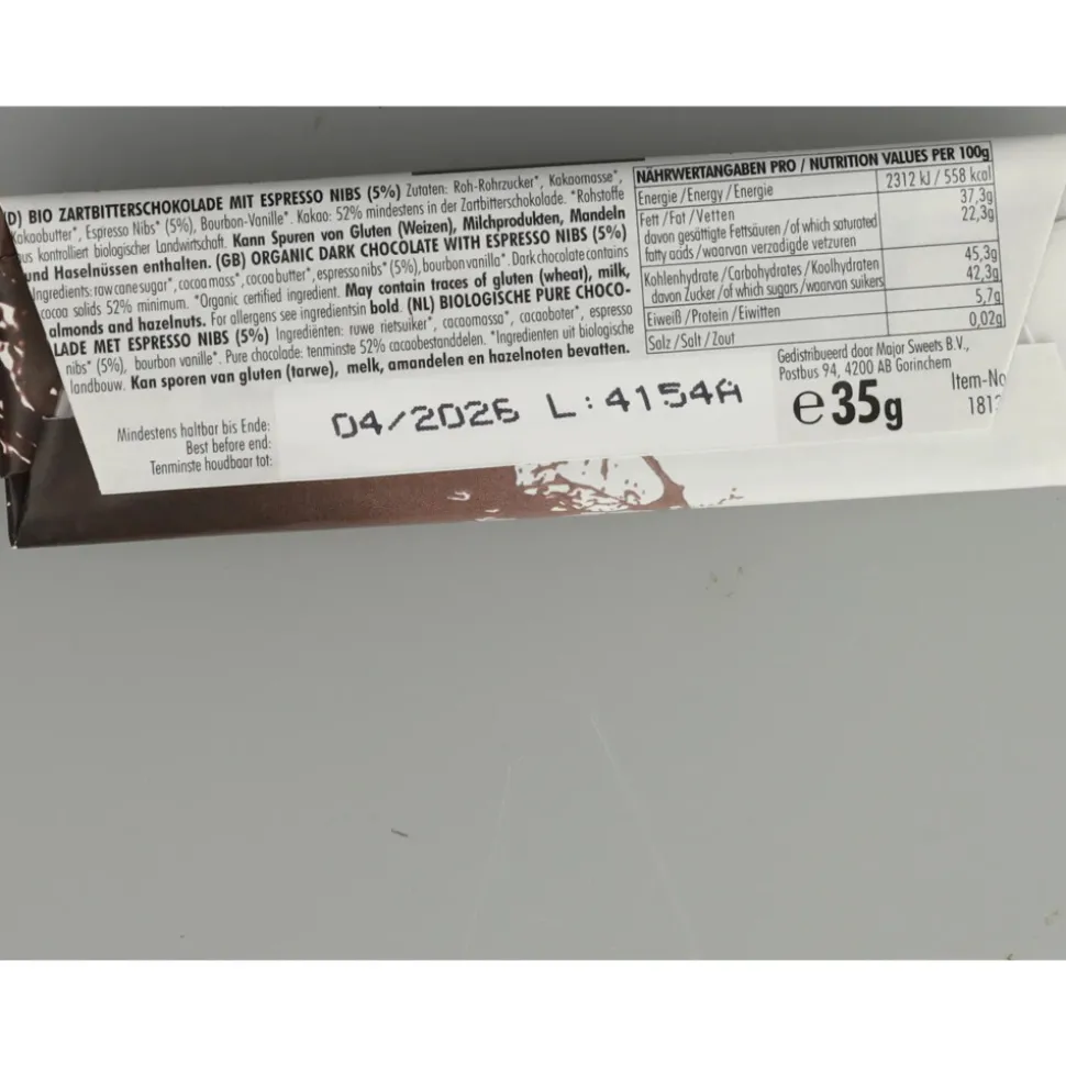 Ruwe rietsuiker *, cacaomassa *, cacaoboter *, espresso nibs * (5%), bourbonvanille *, bevat tenminste 52% pure cacaobestanddelen.