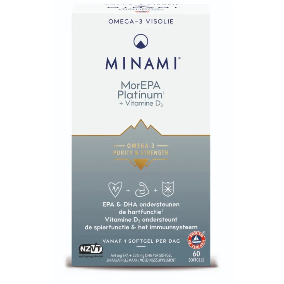 Minami MorEPA Platinum + Vitamine D3 is speciaal ontwikkeld voor actieve personen. Het heeft de hoogste concentratie omega-3 per softgel, tot wel 90-95%. Door het hoge omega-3-gehalte geeft MorEPA Platinum je hart de beste ondersteuning tijdens je training.