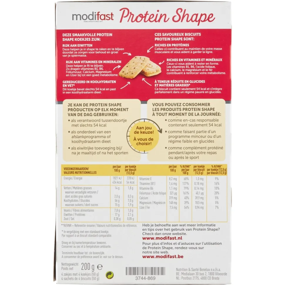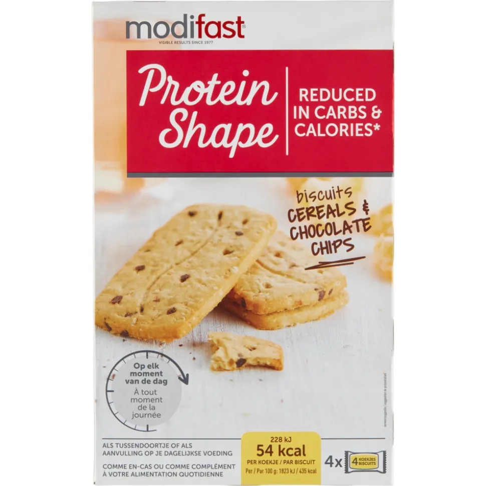 Modifast Protein Shape Koekjes Graan-Chocolade zijn heerlijke eiwitrijke koekjes die prima passen in de Protein Shape 3.2.2 afslankmethode van Modifast. De eiwitten in deze biscuits zorgen ervoor dat het hongergevoel wegblijft en dat uw spieren intact blijven. Bovendien bevat het slechts 55 kcal per koekje en de koekjes zijn per 4 stuks verpakt, handig om mee te nemen.