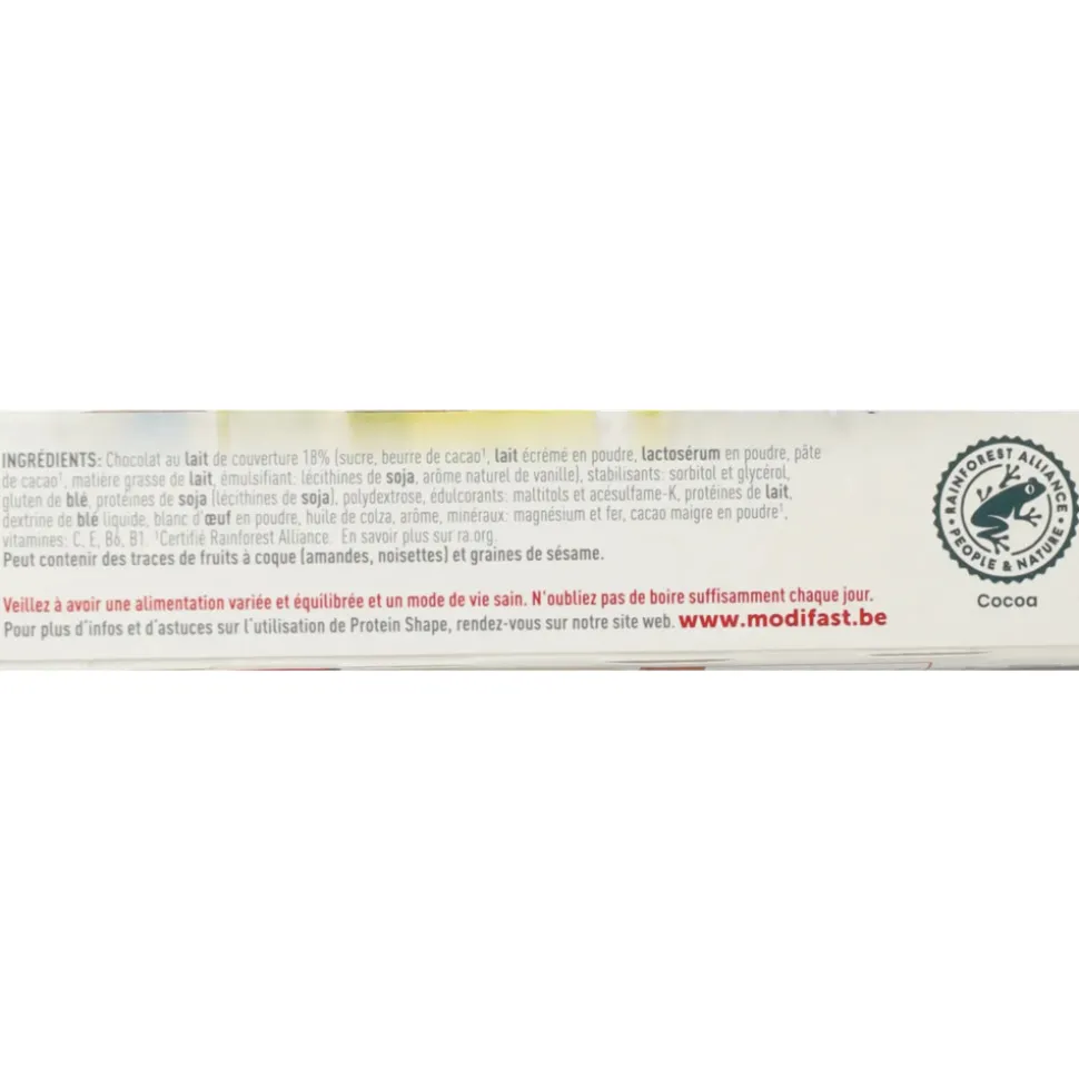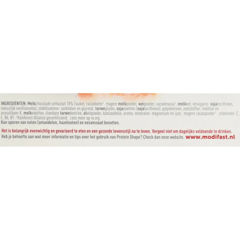 Melkchocolade omhulsel 18% (suiker, cacaoboter^1, magere melkpoeder, weipoeder, cacaomassa^1, melkvet, emulgator: sojalecithinen, natuurlijk vanillearoma), stabilisatoren: sorbitolen en glycerol, tarwegluten, sojaeiwitten (sojalecithinen), polydextrose, zoetstoffen: maltitol en acesulfaam-K, melkeiwitten, vloeibare tarwedextrine, eiwitpoeder, koolzaadolie, aroma, mineralen: magnesium en ijzer, magere cacaopoeder^1, vitaminen: C, E, B6, B1.