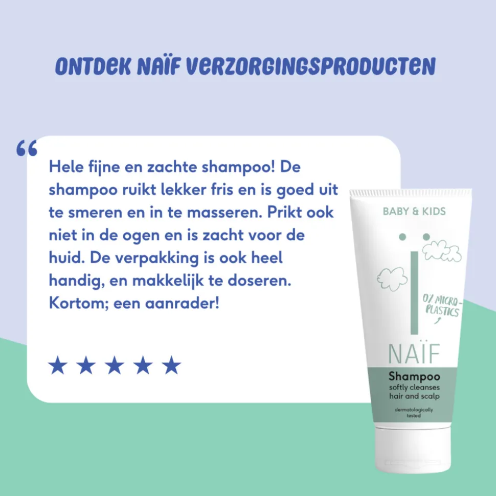 De Naïf Baby & Kids Nourishing Shampoo is een shampoo met ingrediënten van natuurlijke oorsprong die mild reinigt, verzorgt én mild is voor de ogen van je kleintje. De shampoo is zelfs voor je baby zonder haar, want de babyshampoo is ook goed bij het voorkomen van een droge hoofdhuid! Ook de meest gevoelige huid heeft baat bij deze shampoo.
