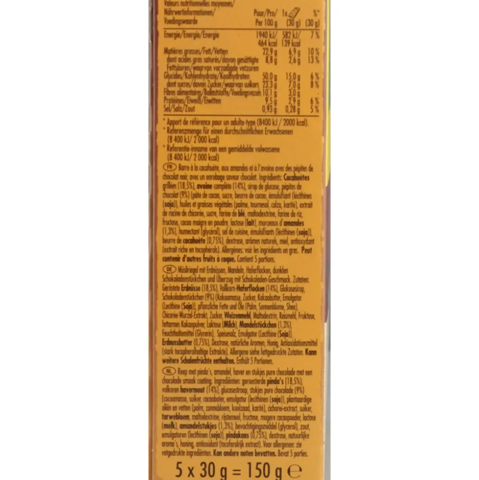 Geroosterde pinda’s (18,5%), volkoren havermout (14%), glucosestroop, stukjes pure chocolade (9%) (cocoamassa, suiker, cacaoboter, emulgator (lecithinen (soja)), plantaardige oliën en vetten (palm, zonnebloem, koolzaad, karité), cichorei-extract, suiker, tarwebloem, maltodextrine, rijstemeel, fructose, magere cacaopoeder, lactose (melk), amandelstukjes (1,3%), bevochtigingsmiddel (glycerol), zout, emulgatoren (lecithinen (soja)), pindakaas, dextrose, natuurlijke aroma’s, honing, antioxidant (tocoferolrijk extract).