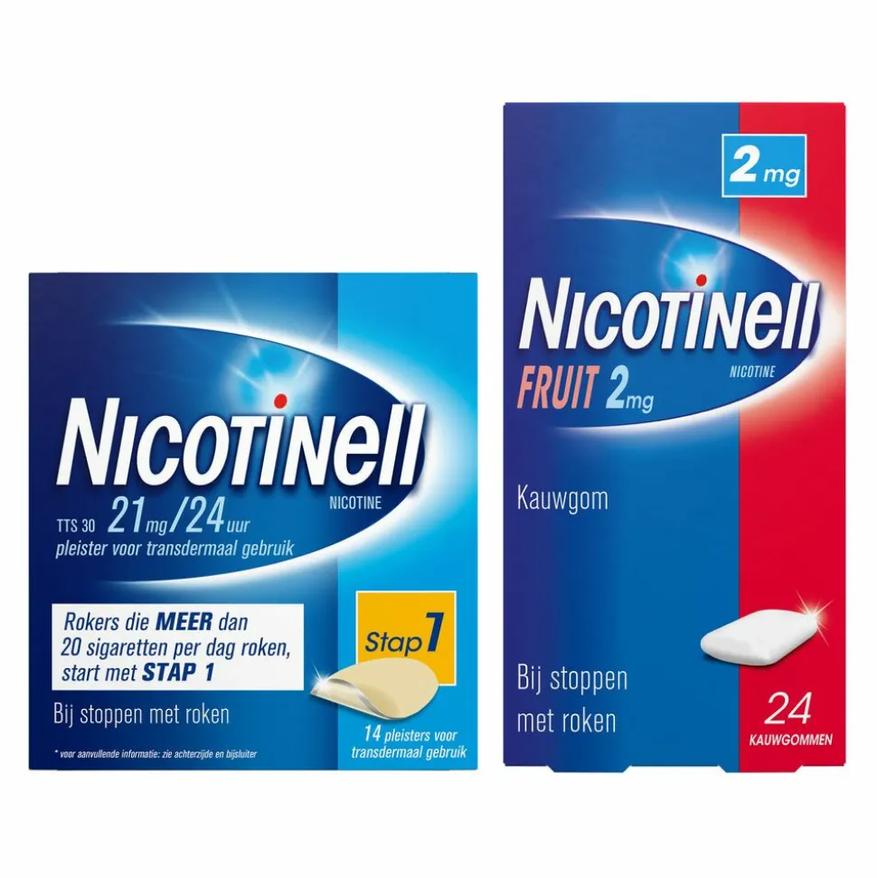 Nicotinell Combinatie therapie: Pleister 21 mg 14 st + Kauwgom Fruit 2mg 24 st Pakket