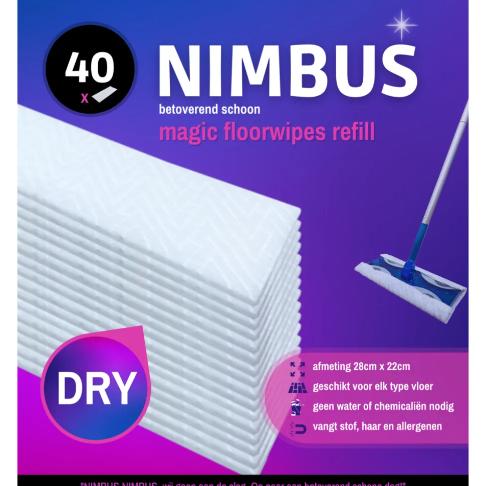 Met onze handige navulverpakkingen hoef je je geen zorgen te maken dat je zonder de kracht van NIMBUS Magic Floorwipes komt te zitten. Blijf gewoon schoonmaken en geniet van de glanzende resultaten! Het schoonhouden van je huis was nog nooit zo eenvoudig en bevredigend. Geef je huis de aandacht die het verdient en laat het stralen met NIMBUS Magic Floorwipes Refill.