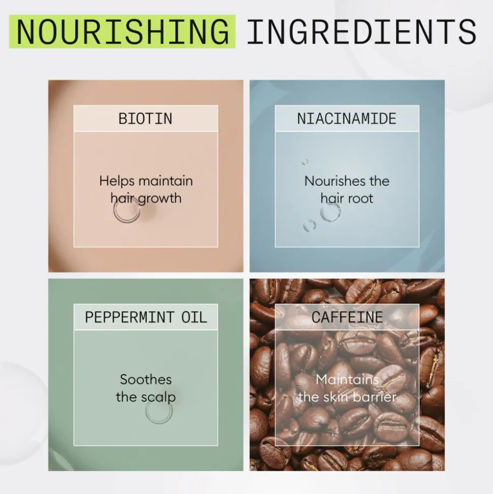 Treatment: Aqua/Water/Eau, Niacinamide, Phenylbenzimidazole Sulfonic Acid, Caffeine, Polysorbate 20, Benzophenone-4, Phenoxyethanol, Sodium Benzoate, Benzyl Alcohol, PEG-12 Dimethicone, Sodium Hydroxide, Cocamidopropyl Betaine, Acetamide MEA, Propylene Glycol, Tetrasodium EDTA, Methyl Nicotinate, Mentha Arvensis Leaf Oil, Parfum/Fragrance, Polysorbate 80, Polysorbate 60, PEG-23M, Mentha Piperita (Peppermint) Oil, Limonene, Camellia Sinensis Leaf Extract, Cystine Bis-PG-Propyl Silanetriol, Tocopheryl Acetate, Lecithin, Biotin, Citrus Paradisi (Grapefruit) Peel Extract, Humulus Lupulus (Hops) Flower Extract, Urtica Dioica (Nettle) Leaf Extract, Silica, Citric Acid, Vaccinium Myrtillus Leaf Extract, Acer Saccharum (Sugar Maple) Extract, Citrus Limon (Lemon) Peel Extract, Saccharum Officinarum/Sugar Cane Extract/Extrait de canne à sucre, Faex Extract/Yeast Extract/Extrait de levure, Propylparaben, Citrus Aurantium Dulcis (Orange) Fruit Extract, Potassium Sorbate, Maltodextrin, Methylparaben, Ethylparaben, Butylparaben, BHT.