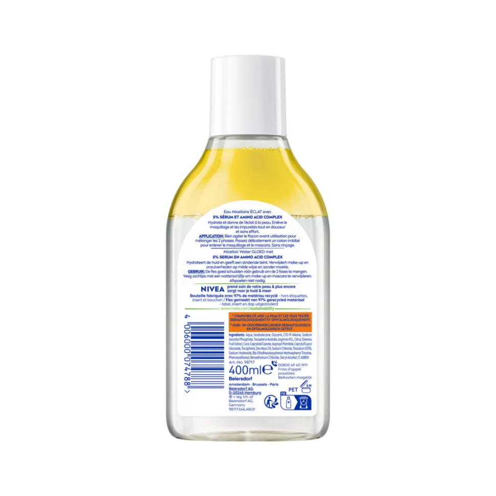 NIVEA Micellar Water Brightening is een milde reiniger speciaal ontwikkeld voor de doffe en gevoelige huid. De unieke micellaire technologie verwijdert effectief make-up en onzuiverheden, zonder de huid te irriteren. De formule met Hydra IQ hydrateert de huid intens en geeft een stralende, egale teint.