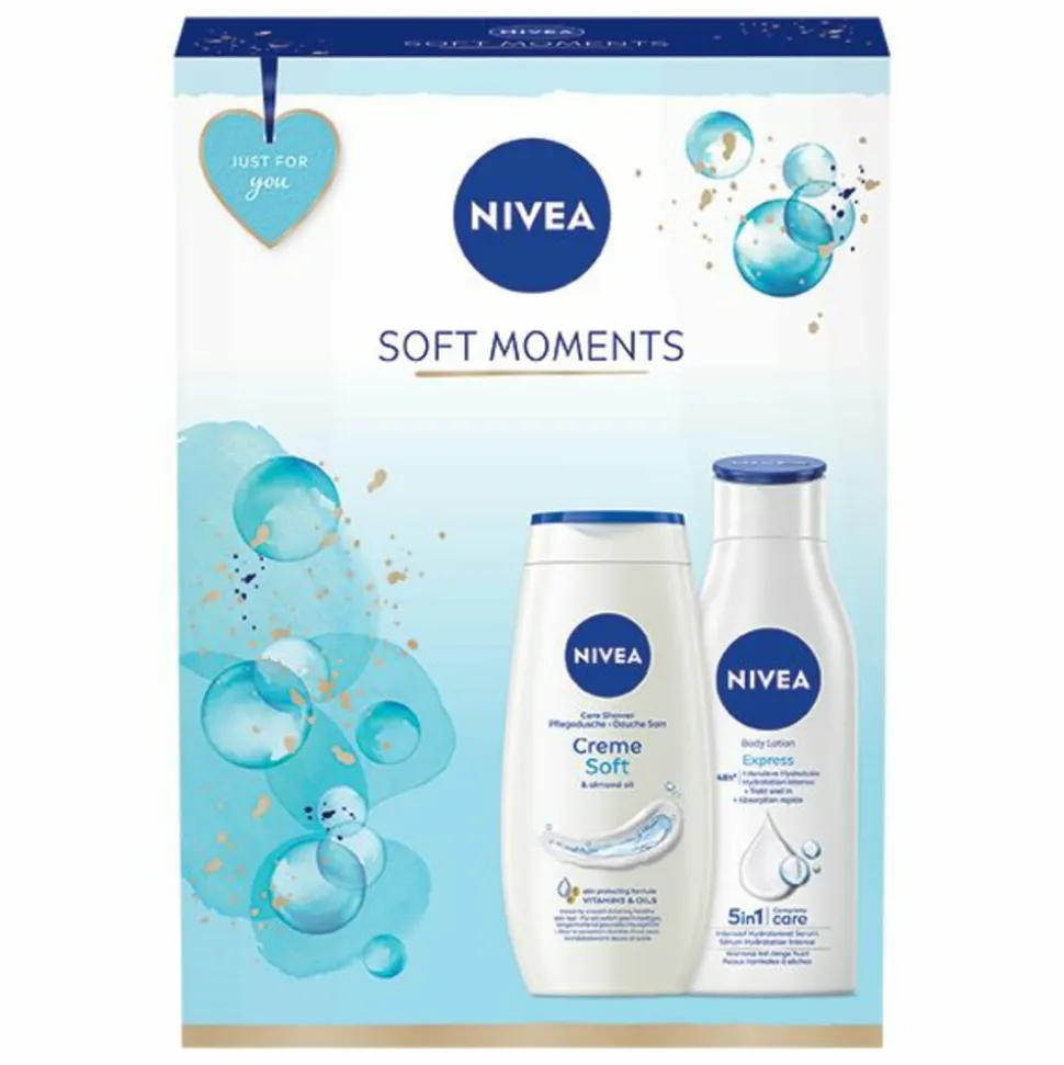 De NIVEA Soft Moments geschenkset, een ideaal cadeau voor jezelf of om weg te geven. Deze geschenkset bevat de NIVEA Crème Soft Douchecrème 250ml en de NIVEA Express Body Lotion 250ml. De NIVEA Creme Soft Douchecrème 250ml, is een verzorgende douchecrème voor een gehydrateerd huidgevoel. Laat deze douchecrème met amandelolie je huid omhullen met verzorgend zacht schuim, terwijl de milde geur je zintuigen streelt. De verzorgende formule verwent je huid en laat haar zacht en gehydrateerd aanvoelen. Maak van een alledaagse douche een moment om te genieten met de verzorging van NIVEA. De formule is 99% biologisch afbreekbaar* en respecteert het microbioom van de huid. Een gezond uitziende huid voelde nog nooit zo goed. Douchecrème met amandeloliën. Een formule die het microbioom van de huid respecteert. Met een 99% biologisch afbreekbare formule* *volgens OESO of gelijkwaardige methoden, De NIVEA Express Body Lotion 250ml geeft je meer dan een gehydrateerde en zachtere huid! De formule bevat een Intensief Hydraterend Serum en Zeemineralen. De Verzorgende Body Lotion biedt een complete 5in1 huidverzorging en zorgt voor 48 uur* *Corneometrie meting, 30 vrouwen, 2016