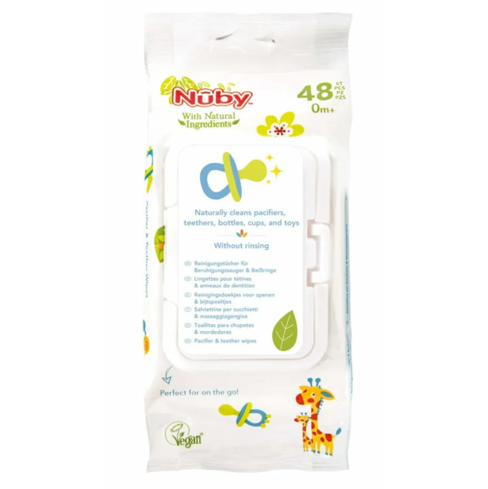 Nuby Reinigingsdoekjes zijn gemaakt van natuurlijke ingrediënten en Citroganix om baby’s fopspeen, bijtring, flesje of bijvoorbeeld speelgoed schoon te maken zonder het daarna af te hoeven spoelen. Deze vochtige doekjes zitten in een hersluitbare verpakking zodat ze niet uitdrogen en zijn erg handig voor onderweg.