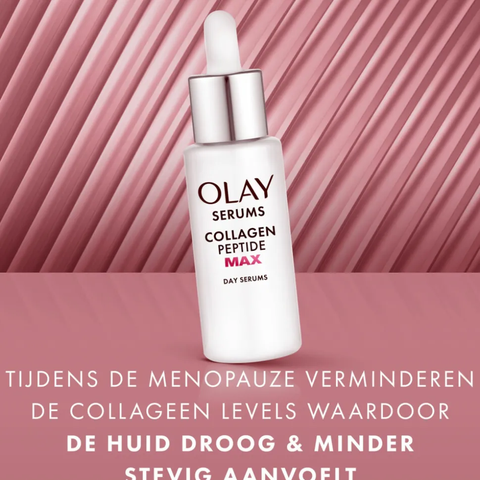 Wist je dat? Tijdens de menopauze beginnen de collageenniveaus te dalen, waardoor de huid droog en minder stevig wordt. Het is bewezen dat het Collagen Peptide MAX dagserum van Olay de zichtbare tekenen van de menopauze in 3 acties aanpakt: Hydrateert, verstevigt, herstelt. De huid voelt zachter en soepeler aan in slechts 1 dag. Na 14 dagen is 88% van de vrouwen het erover eens dat hun huid gekalmeerd en comfortabeler aanvoelt! Dit krachtige serum, gemaakt met 99% pure niacinamide, de hoogste concentratie collageenpeptide van Olay en +50%* hydraterende ingrediënten, maakt de huid zichtbaar steviger en strakker!