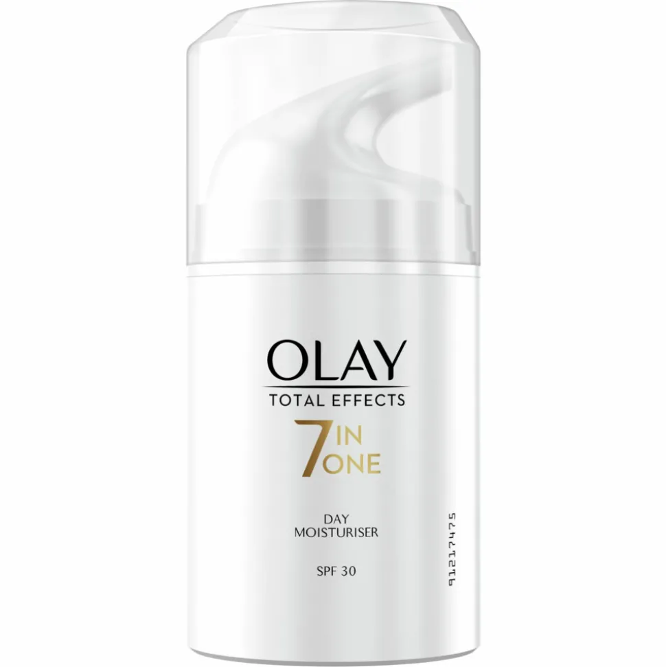 Een gevoede en beschermde huid in één stap! Deze hydraterende dagcrème met meervoudige werking biedt 7 huidvoordelen in één eenvoudige stap: ze hydrateert, zorgt voor een mooie gloed, egaliseert de huidteint, minimaliseert de poriën, maakt glad en vult op, vermindert fijne lijntjes en rimpels en beschermt tegen schadelijke invloeden van buitenaf. De formule van Olay Total Effects, zit vol met vitaminen B3, C, E en Pro-Vitamine B5, die antioxidanten bevatten en de hydratatie en vernieuwing van het huidoppervlak verbeteren. Breedspectrum SPF30 biedt UVA/UVB-bescherming in een niet-vette formule. Klinisch geteste formule. Formule voor droge, vette en gecombineerde huid. Verstopt de poriën niet.
