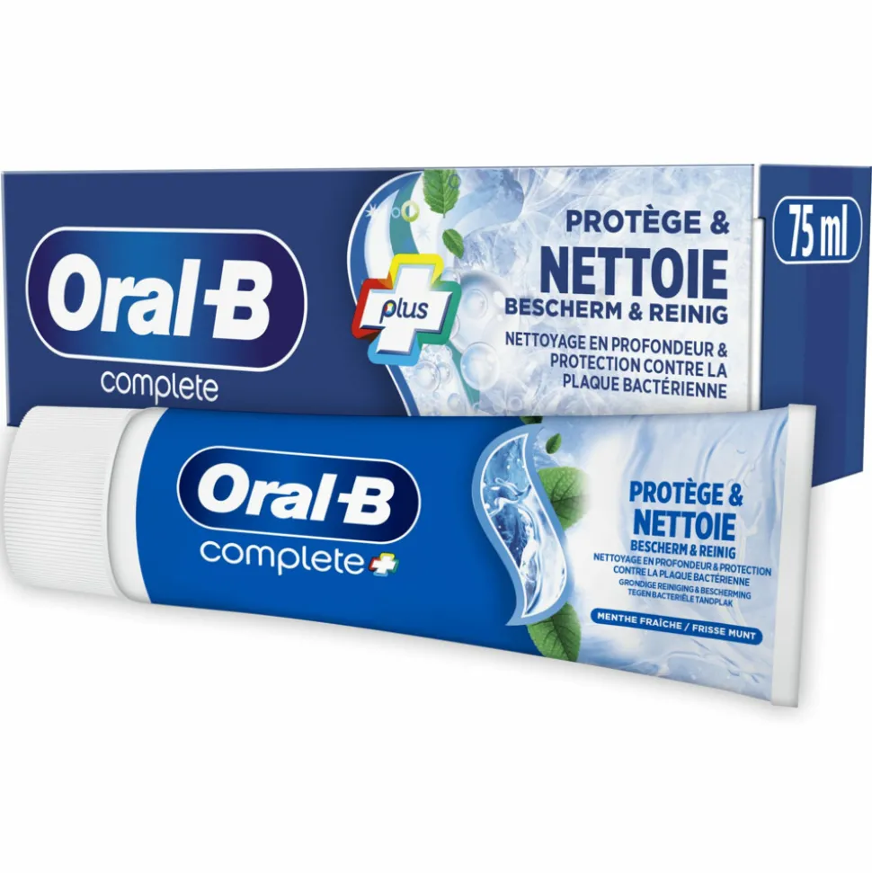 Oral-B Complete Plus Protection & Clean tandpasta reinigt grondig, beschermt tegen bacteriële tandplak, biedt onmiddellijke en langdurige frisheid en maakt witter door oppervlakkige verkleuringen te verwijderen.