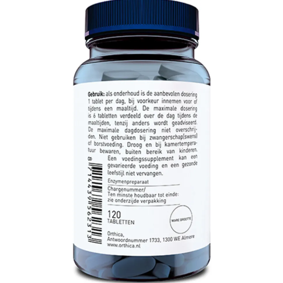 Orthica Enzym Complex bevat 4 enzymen onmisbaar zijn tijdens de spijsvertering want de enzymen bewerken het voedsel dat wij eten tot voedingsstoffen die het lichaam nodig heeft om te functioneren. De enzymen zijn lipase, amylase, cellulase en protease. Het lichaam maakt deze enzymen zelf aan.