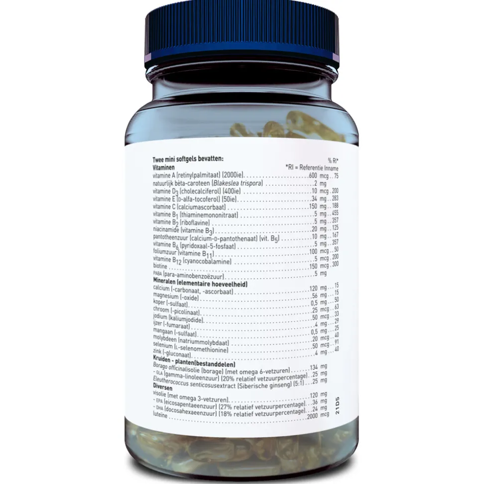 Samenstelling per dagdosering van 2 softgels:Vitaminen: Vitamine A (retinylpalmitaat) (1000ie) 600 mcg (=75 % ADH)Natuurlijk bèta-caroteen (Dunaliella salina) 2 mg Vitamine D3 (cholecalciferol) (50ie) 10 mcg (=200 % ADH)Vitamine E (D-alfa-tocoferol) (25ie) 34 mg (=284 % ADH)Vitamine C (calciumascorbaat) 150 mg (=188 % ADH)Vitamine B1 (thiaminemononitraat) 5 mg (=454 % ADH)Vitamine B2 (riboflavine) 5 mg (=356 % ADH)Niacinamide (vitamine B3) 20 mg (=125 % ADH)Pantotheenzuur (calcium-D-pantothenaat) (vit. B5)10 mg (=167 % ADH)Vitamine B6 (biologisch actieve vorm pyridoxaal-5-fosfaat) 5 mg (=357 % ADH)Foliumzuur (vitamine B11) 100 mcg (=50 % ADH)Vitamine B12 (cyanocobalamine) 5 mcg (=200 % ADH)Biotine 150 mcg (=300 % ADH)PABA (para-aminobenzoëzuur) 5 mg Mineralen (elementaire hoeveelheid):Calcium (-carbonaat) 120 mg (=15 % ADH)Magnesium (-oxide) 56 mg (=15 % ADH)Koper (-sulfaat) 500 mcg (=50 % ADH)Chroom (-picolinaat) 26 mcg (=63 % ADH)Jodium (kaliumjodide) 50 mcg (=33.2 % ADH)Ijzer (-fumaraat) 4 mg (=29 % ADH)Mangaan (-sulfaat) 0,5 mg (=25 % ADH)Molybdeen (natriummolybdaat) 20 mcg (=40 % ADH)Selenium (L-selenomethionine) 50 mcg (=91 % ADH)Zink (-gluconaat) 4 mg (=40 % ADH)% ADH= Het percentage van de Aanbevolen Dagelijkse Hoeveelheid. Kruiden – planten (bestanddelen):Borago officinalisolie (borage) (met omega-6-vetzuren) 134 mg – GLA (gamma-linoleenzuur) (20% relatief vetzuurpercentage) 25 mg Eleutheroccus senticosusextract (Siberische ginseng) (5:1) 25 mg Diversen:Visolie (met omega-3-vetzuren) 120 mg – EPA (eicosapentaeenzuur) (31% relatief vetzuurpercentage) 38 mg – DHA (docosahexaeenzuur) (20% relatief vetzuurpercentage) 25 mg luteïne 2000mcg ADH = Aanbevolen dagelijkse hoeveelheid Ingrediënten:mineralen, vitaminen, gelatine, zonnebloemolie, geleermiddel (glycerine), Borago officinalisolie, VISOLIE, plantaardige olie (uit palm, shea), luteïnecomplex, Eleutherococcus senticosusextract, stabilisator (bijenwas), emulgator (zonnebloemlecithine), kleurstof (ijzeroxide rood), paba.Vrij van:gluten, lactose, soja-eiwit, gist, sacharose, synthetische conserveermiddelen, synthetische kleur-, geur- en smaakstoffen.Allergeneninformatie:Bevat vis.Dosering en GebruikDe aanbevolen dosering is 2 softgels per dag, tenzij anders wordt geadviseerd. Bij voorkeur innemen tijdens of na een maaltijd. De aanbevolen dagdosering niet overschrijden. Extra informatie: