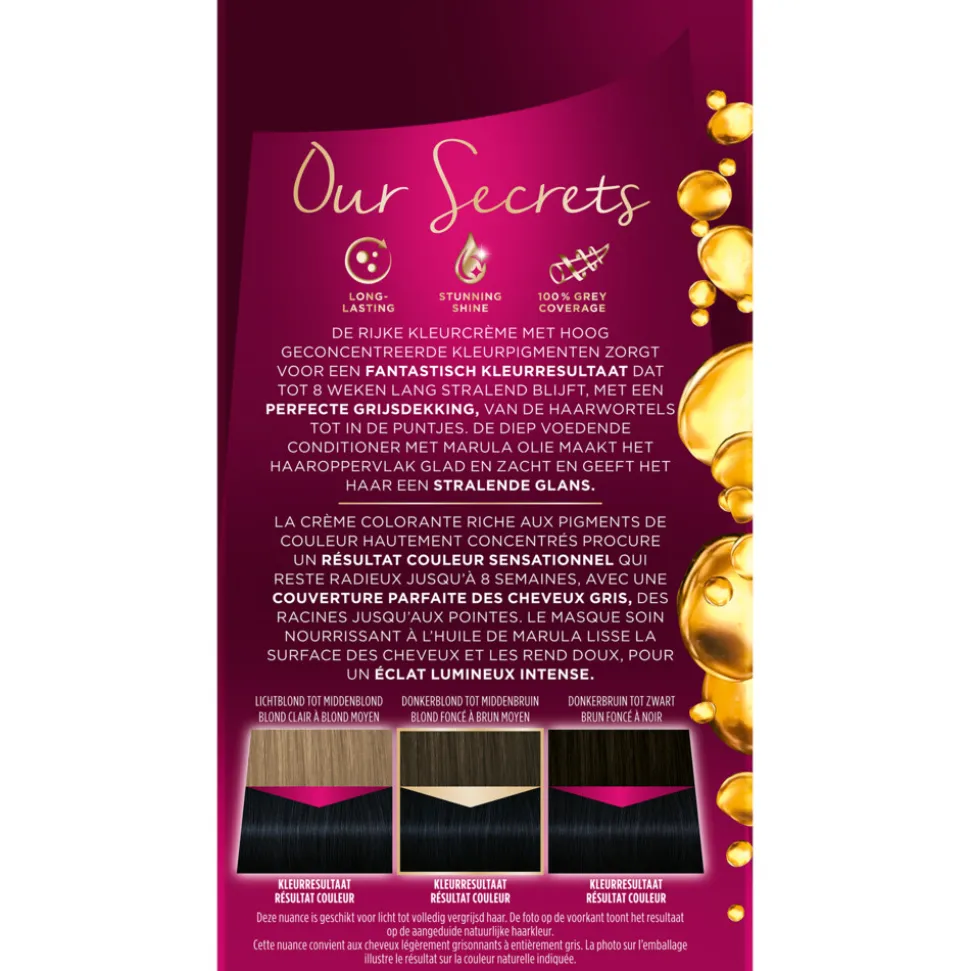 De rijke kleurcrème met hoog geconcentreerde kleurpigmenten zorgt voor een fantastisch kleurresultaat dat tot 8 weken lang stralend blijft. De haarverf bevat een perfecte grijsdekking, van de haarwortels tot in de puntjes. De diep voedende conditioner met natuurlijke Marula olie maakt het haaroppervlak glad & zacht en geeft het haar een stralende glans.