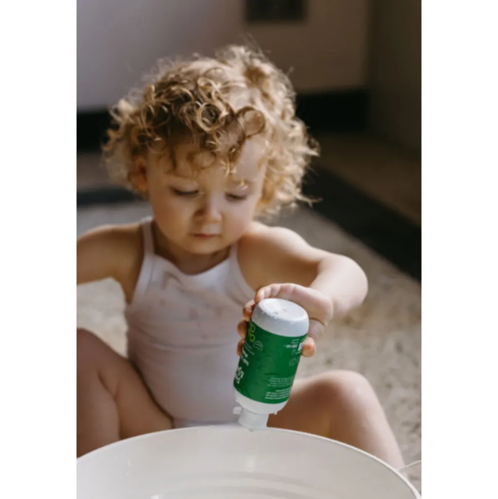 Doe tijdens het douchen of bad een klein scheutje shampoo op hand of washand en masseer de huid en het haar van uw baby licht. Daarna goed afspoelen met water.