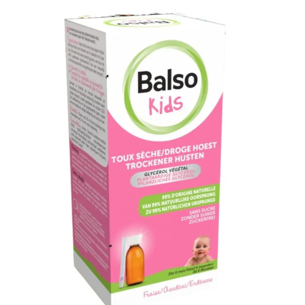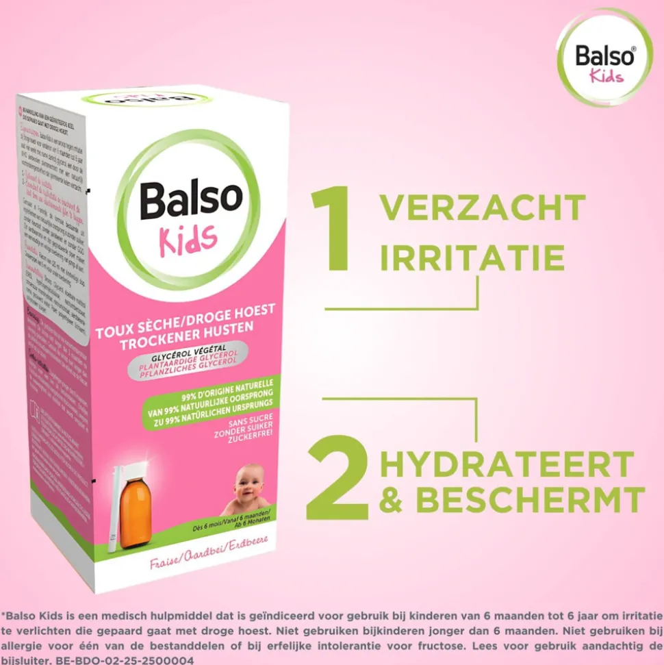 Balso Kids-Siroop is een medisch hulpmiddel** om irritatie door droge hoest te verlichten bij zuigelingen en kinderen vanaf 6 maanden* tot 6 jaar. De siroop is op basis van voornamelijk plantaardige glycerol. Glycerol heeft een dubbele werking; het verzacht keelirritatie door droge hoest en hydrateert en beschermt de keel tegen agressieve omgevingsfactoren met een beschermende film. De siroop heeft een lekkere aardbeiensmaak.