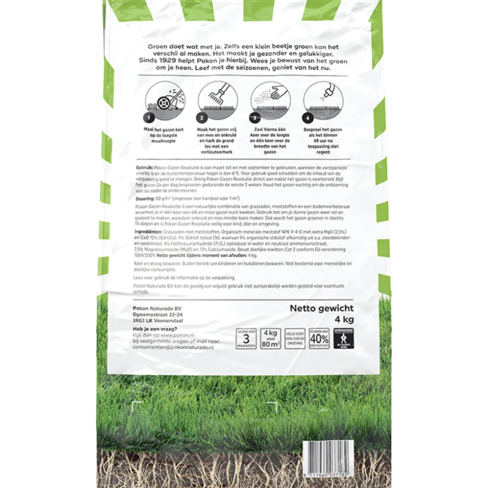 Pokon Gazon Revolutie is een natuurlijke combinatie van graszaden, meststoffen en een bodemverbeteraar waarmee je in één keer een dik en mooi gazon kunt kweken. Gebruik het om je dunne gazon weer vol en gezond te maken, waardoor onkruid en mos minder kans maken. Ook wordt het gazon groener in slechts 15 dagen en is Pokon Gazon Revolutie veilig voor kind, dier en omgeving. Pokon Gazon Revolutie is van maart tot en met september te gebruiken, wanneer de vorstperiode voorbij is en de buitentemperatuur hoger is dan 6 graden Celsius. Voor gebruik goed schudden om de inhoud van de verpakking goed te mengen. Breng Pokon Gazon Revolutie direct aan dat het gazon is voorbereid. Blijf het gazon 2 x per dag besproeien gedurende de eerste 2 weken. Houd het gazon vochtig om de ontkieming van zaden te ondersteunen.