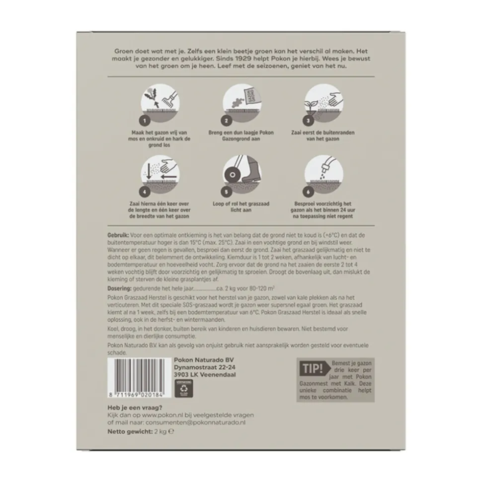 - Pokon Graszaad Herstel is speciaal ontwikkeld voor het snel en effectief herstellen van kale plekken en na het verticuteren van je gazon