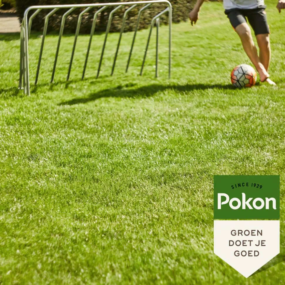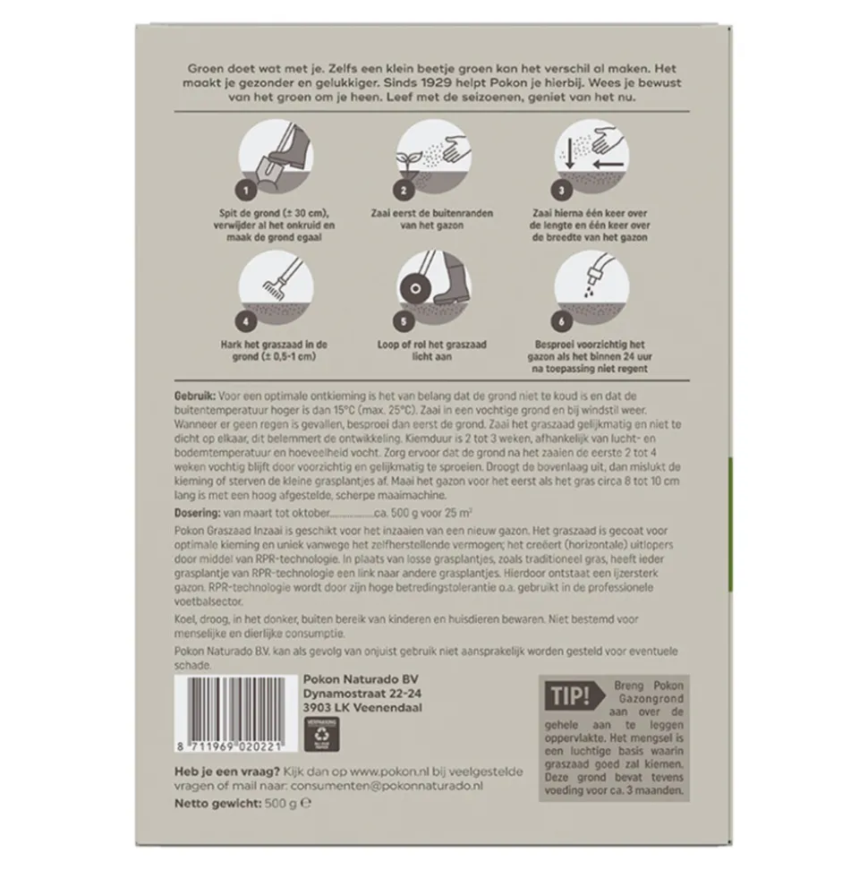 Pokon Graszaad Inzaai is geschikt voor het inzaaien van een nieuw gazon. Het graszaad is gecoat voor optimale kieming en uniek vanwege het zelfherstellende vermogen; het creëert (horizontale) uitlopers door middel van RPR-technologie. In plaats van losse grasplantjes, zoals traditioneel gras, heeft ieder grasplantje van RPR-technologie een link naar andere grasplantjes. Hierdoor ontstaat een ijzersterk gazon, RPR-technologie wordt door zijn betredingstolerantie o.a. gebruikt in de professionele voetbalsector. Voor een optimale ontkieming is het van belang dat de grond niet te koud is en dat de buitentemperatuur hoger is dan 15C (max. 25C). Zaai in een vochtige grond en bij windstil weer. Wanneer er geen regen is gevallen, besproei dan eerst de grond. Zaai het graszaad gelijkmatig en niet te dicht op elkaar, dit belemmert de ontwikkeling. Kiemduur is 2 tot 3 weken, afhankelijk van lucht- en bodemtemperatuur en hoeveelheid vocht. Zorg ervoor dat de grond na het zaaien de eerste 2 tot 4 weken vochtig blijft door voorzichtig en gelijkmatig te sproeien. Droogt de bovenlaag uit, dan mislukt de kieming of sterven de kleine grasplantjes af. Maai het gazon voor het eerst als het gras circa 8 tot 10 cm lang is met een hoog afgestelde, scherpe maaimachine.